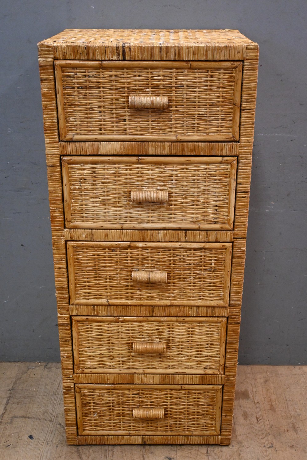 A CANE FIVE DRAWER TALL CHEST (A/F) (133H X 57W X 47D CM) (LEONARD JOEL DELIVERY SIZE: LARGE)