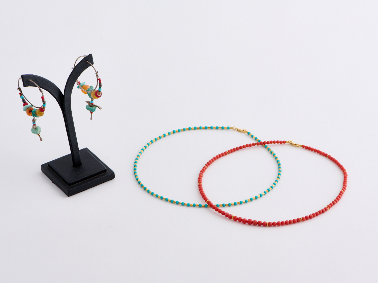 A TURQUOISE AND CORAL NECKLACE IN 22CT GOLD AND A PAIR OF NAVAJO EARRINGS IN SILVER, MEXICAN