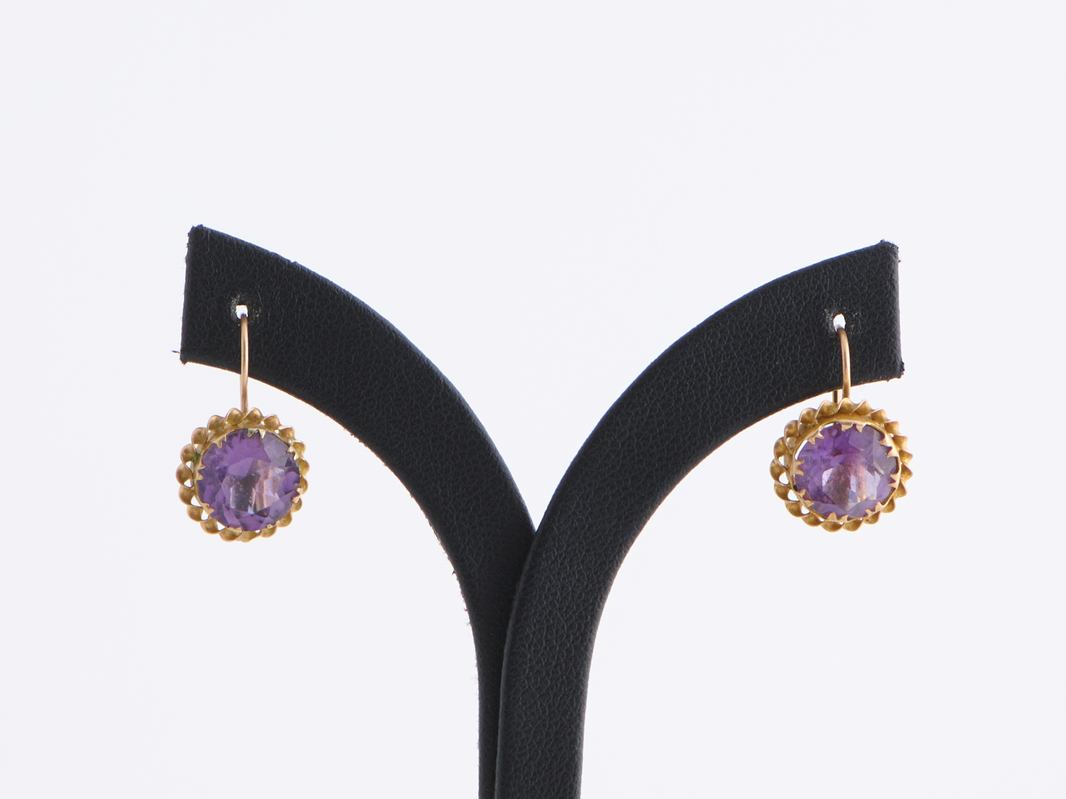A PAIR OF AMETHYST EARRINGS IN 18CT (FRAME) AND 14CT (CONTINENTAL FITTINGS) GOLD, DIAMETER 11MM, 2.3GMS