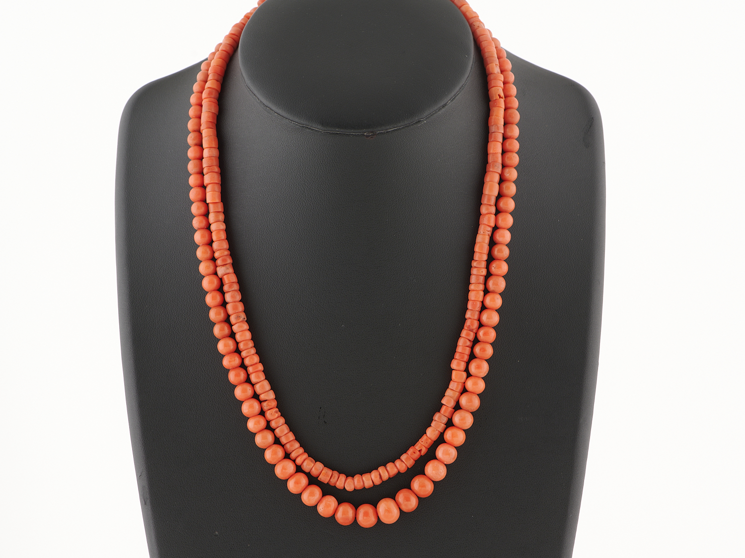 TWO VINTAGE CORAL BEAD NECKLACES, 500MM AND 470MM IN LENGTH
