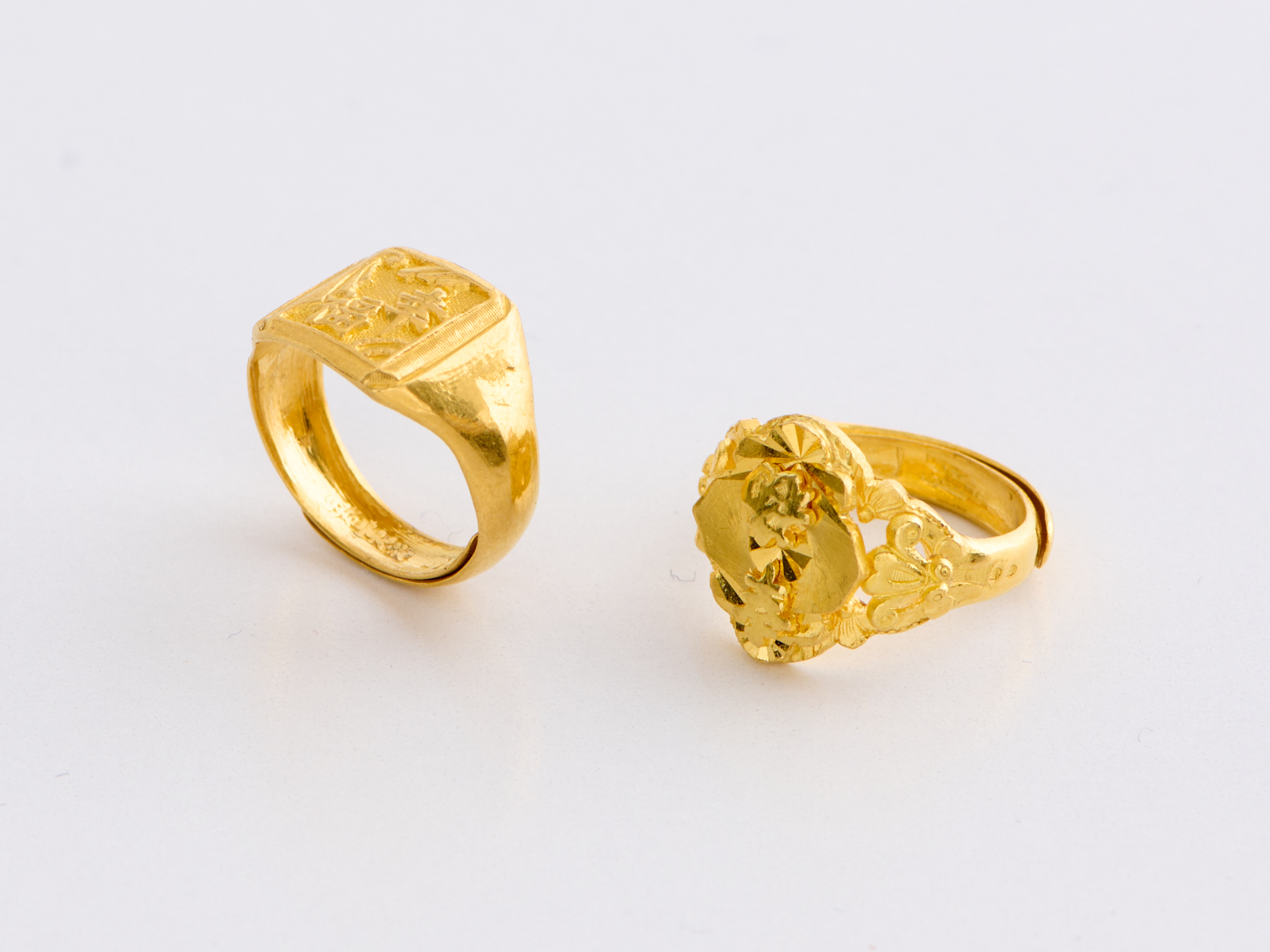 TWO RINGS IN 24CT GOLD, SIZES K AND J, 13.1GMS