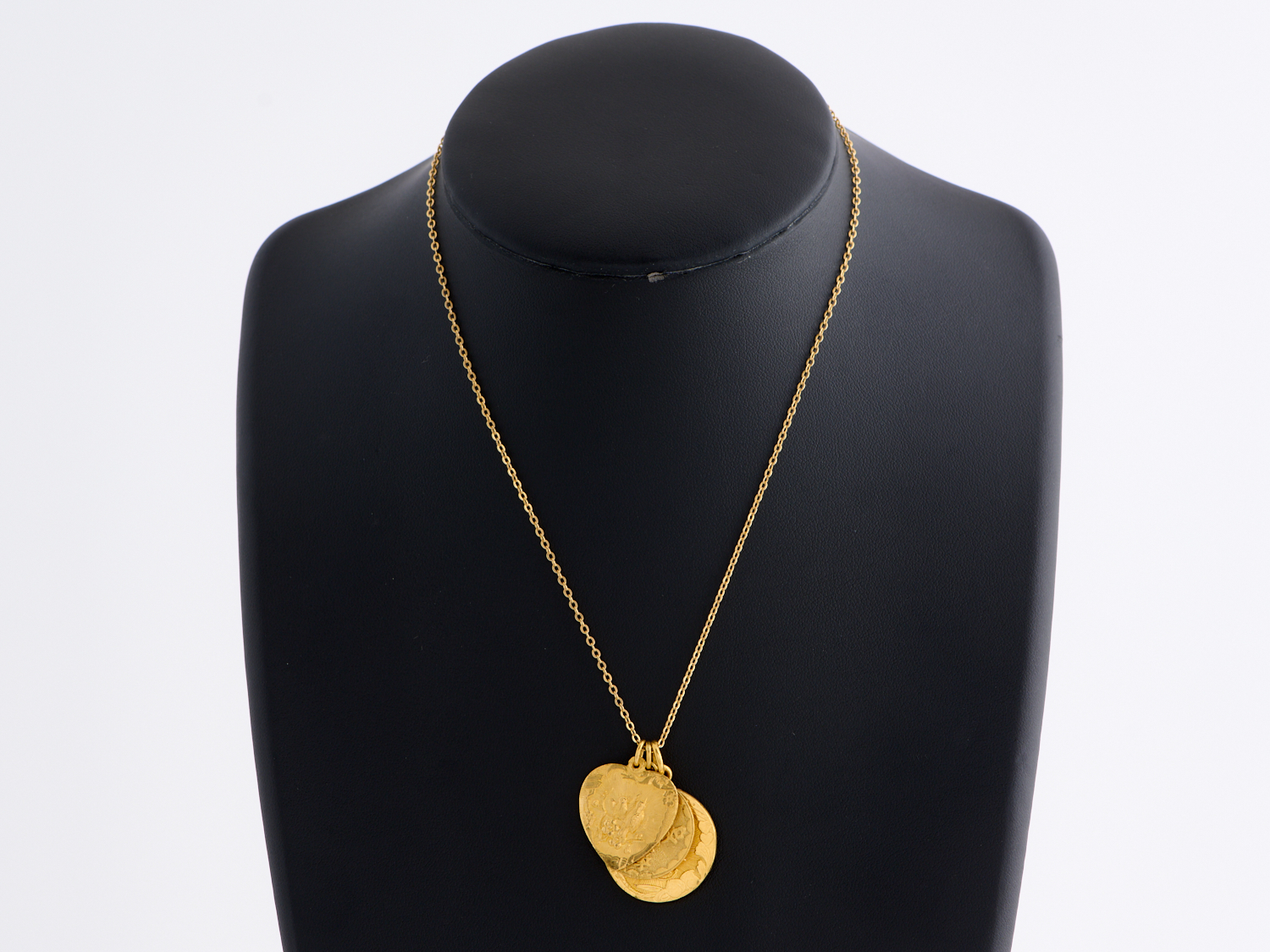 THREE PENDANTS IN 22CT GOLD, TO A CHAIN IN GOLD PLATE, THE PENDANTS WEIGHING APPROXIMATELY 19.87GMS