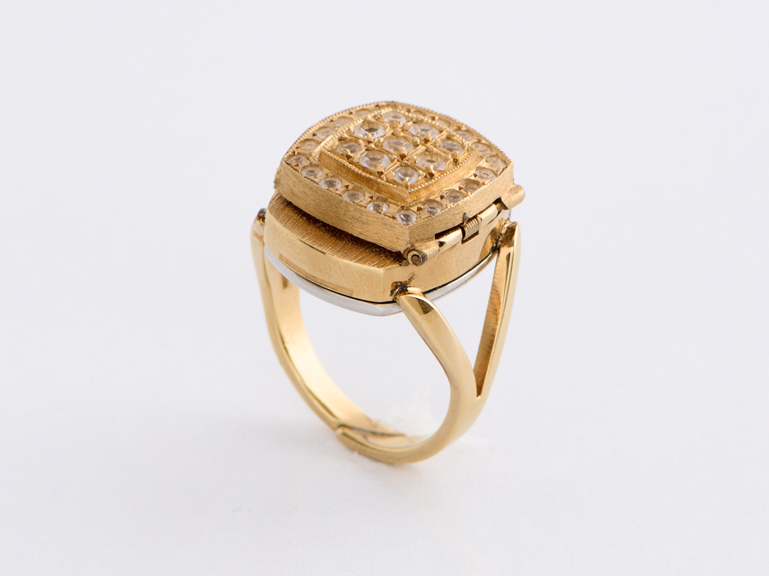 A BUCHERER WATCH RING IN 18CT (SHANK) AND 9CT GOLD (TOP), THE TOP INCLUDING COVER AND BASE MEASURING APPROXIMATLEY 19 X 15MM, SIZE L, 10.8GMS