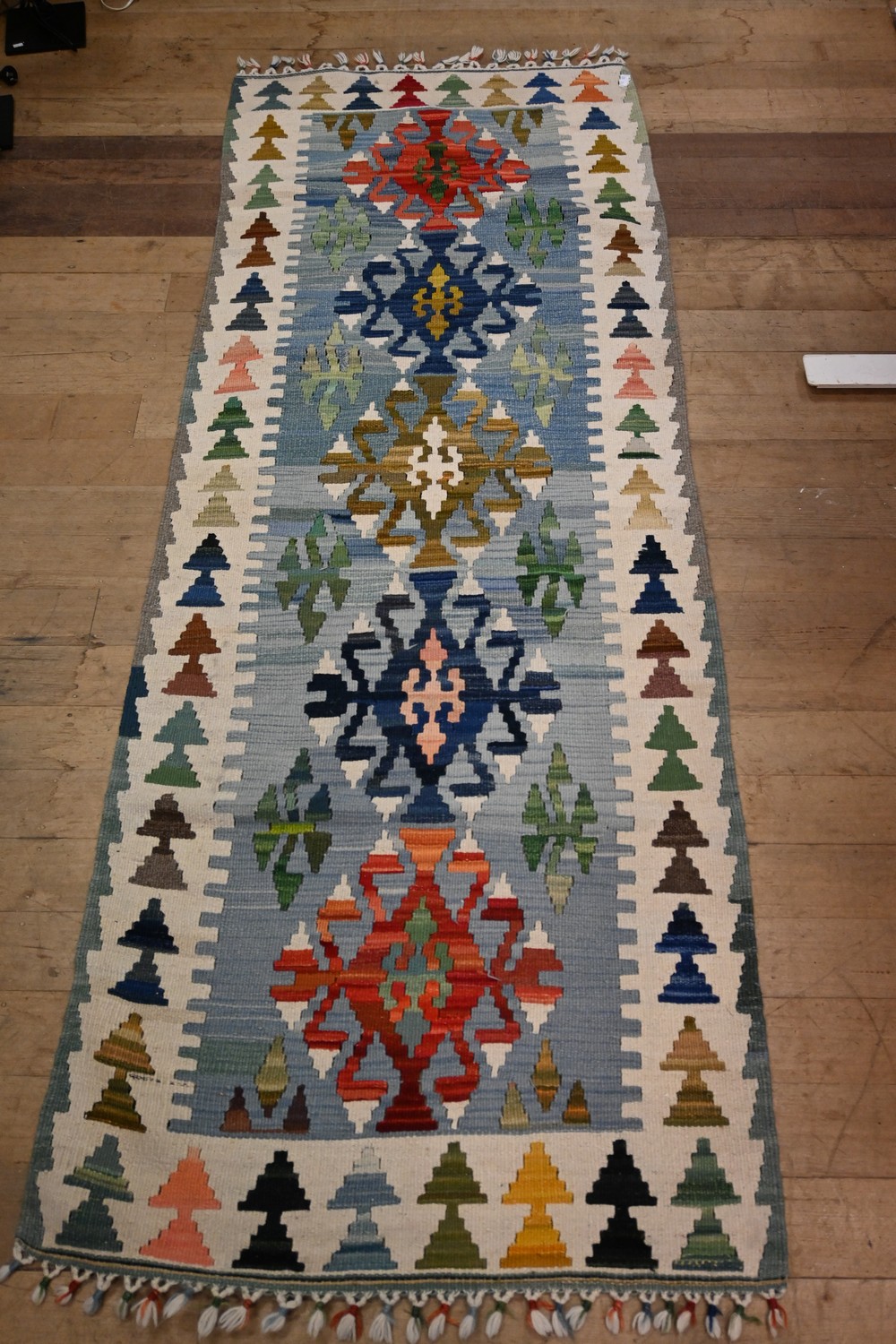 A VINTAGE KILIM RUNNER (A/F) (252 X 89 CM) (LEONARD JOEL DELIVERY SIZE: SMALL)