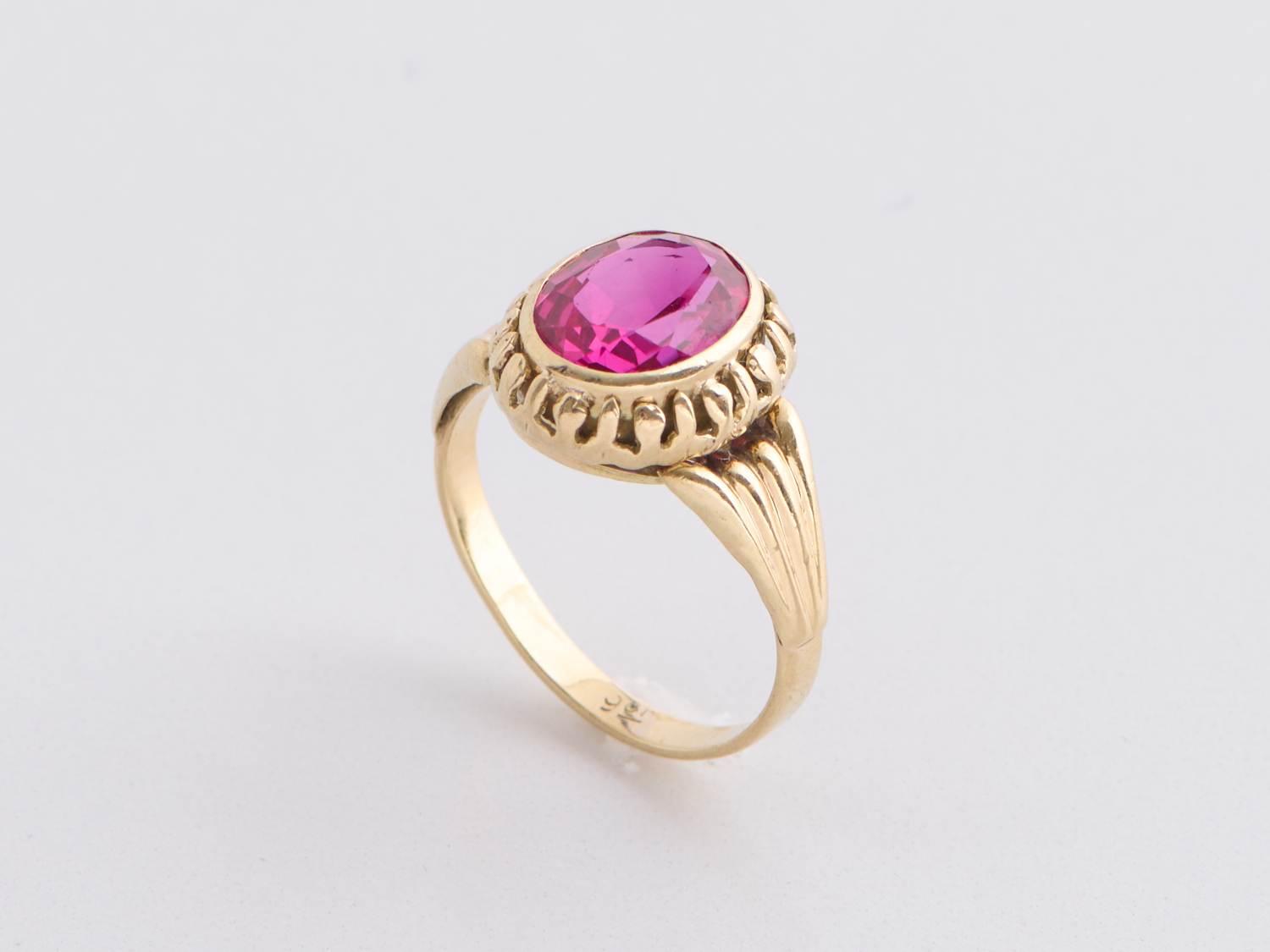 A BEZEL SET SYNTHETIC RUBY RING IN 9CT GOLD, SIZE M, APPROXIMATE WEIGHT 3.17GMS
