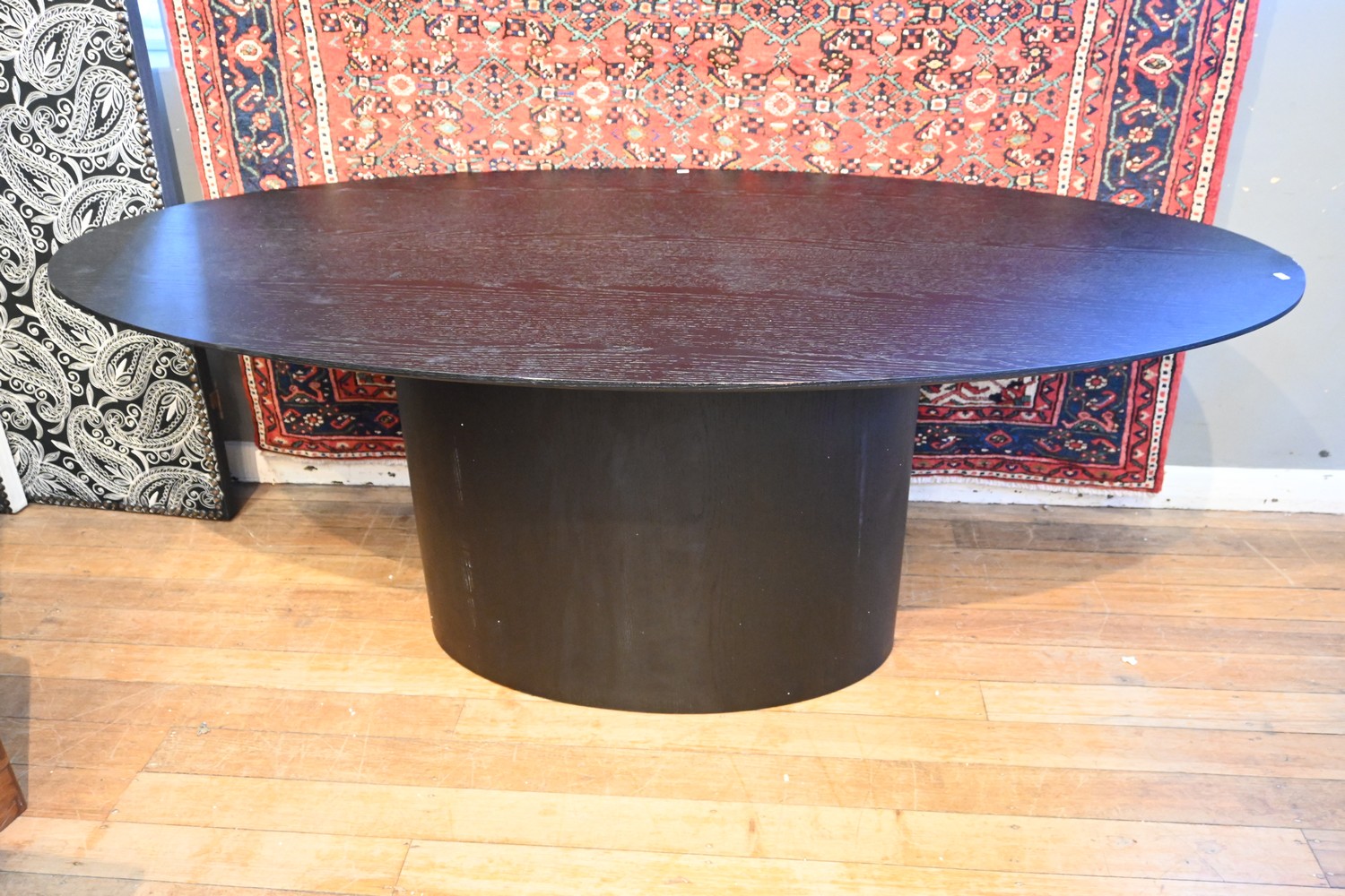 A CONTEMPORARY ELLIPTICAL BLACK STAINED OAK DINING TABLE WITH PEDESTAL BASE (A/F) (78H X 200W X 100D CM) (PLEASE NOTE THIS HEAVY ITEM MUST BE REMOVED BY CLIENTS OR CARRIERS AT THE CUSTOMERS EXPENSE. LEONARD JOEL STAFF CANNOT ASSIST CARRYING THIS ITEM)