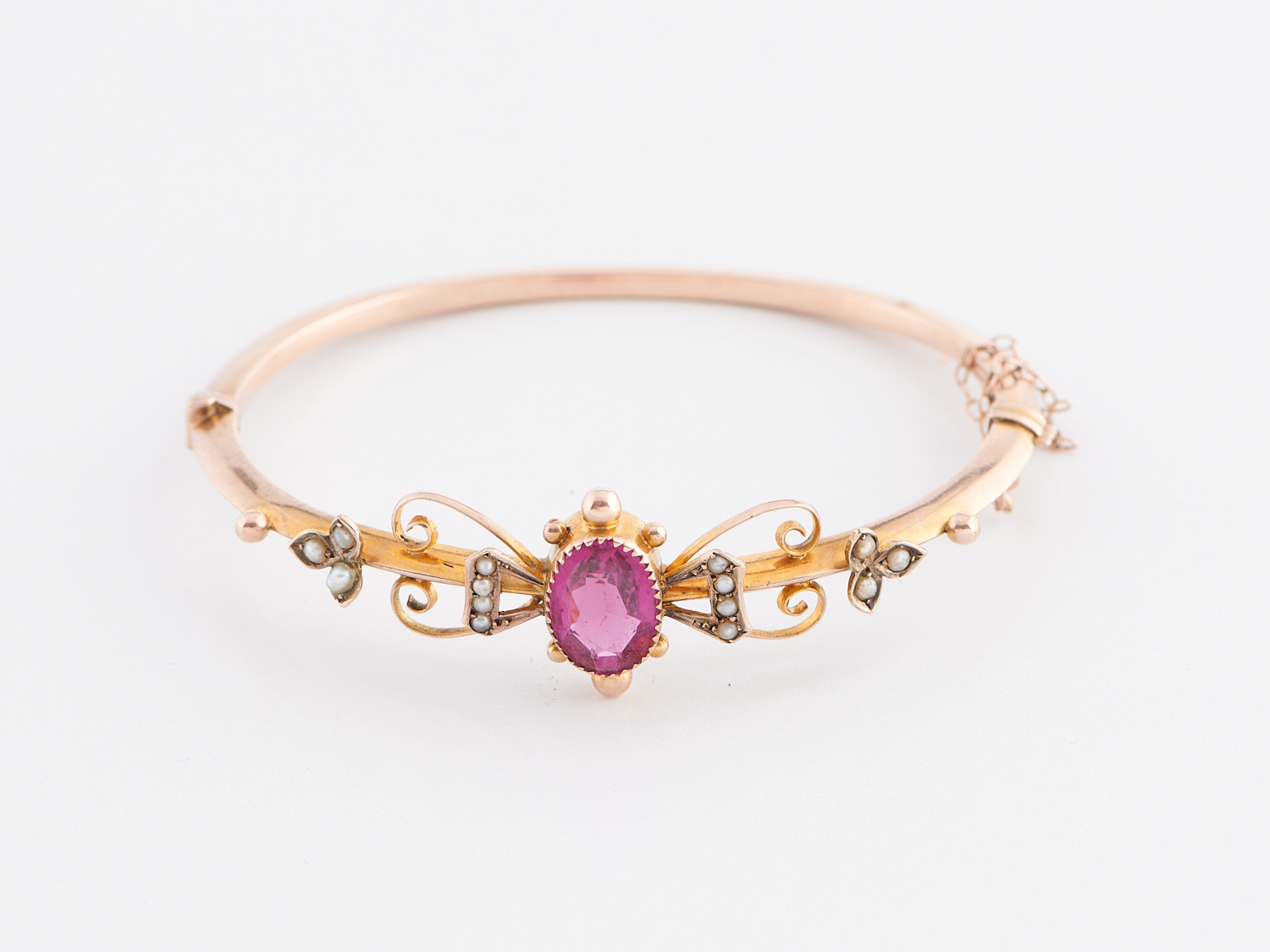 AN ANTIQUE RED STONE AND SEED PEARL HINGE BANGLE IN 9CT ROSE GOLD, INNER MEASUREMENTS APPROXIMATELY 56 X 49MM, APPROXIMATE WEIGHT 9.2GMS