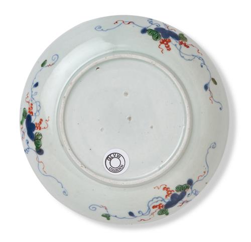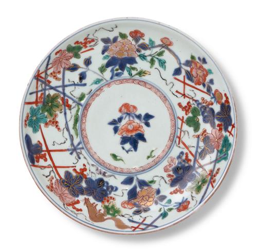 Decorated with peony blossom to the centre surrounded by squirrel amongst peonies and trelissed grapevines in underglaze blue and polychrome enamels with gilded highlights. The base with four spur marks.