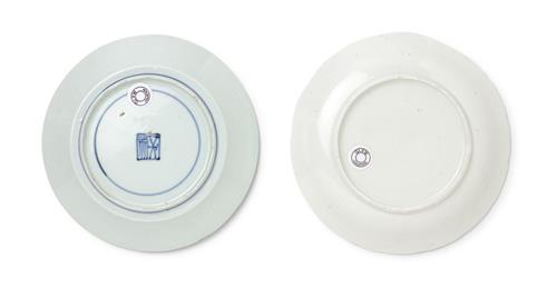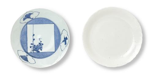 The first moulded with shaped reserves to the cavetto interspersed with blue gingko and fan motifs, the centre decorated with plum blossom against a blue ground. Fuku mark to the base. The second a thinly potted Hakuji (white) dish, moulded in relief with shaped reserves enclosing kanji characters.