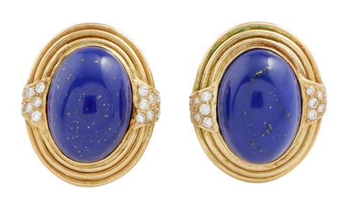 Each earring centring an oval lapis lazuli carved en cabochon, within a stepped concentric gold surround decorated to either side with seven brilliant-cut diamonds together weighing approximately 0.16 carats, to clip fittings, length approximately 24mm.