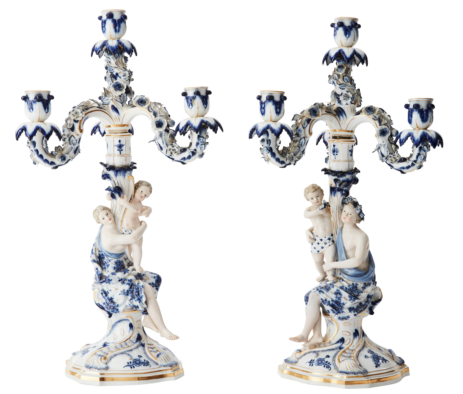 Late 19th century, each with a shaped circular base, one with a male and one female vine leaf draped figure, holding a child on their lap and the scrolled shaft issuing four flower crusted candle branches terminating in foliate nozzles, decorated in underglaze blue and gilt in the blue onion pattern, blue crossed swords mark and various pressnummer to base.