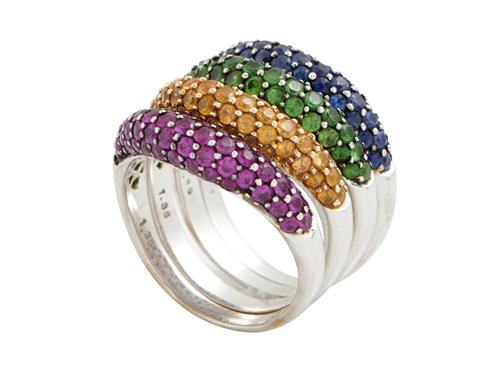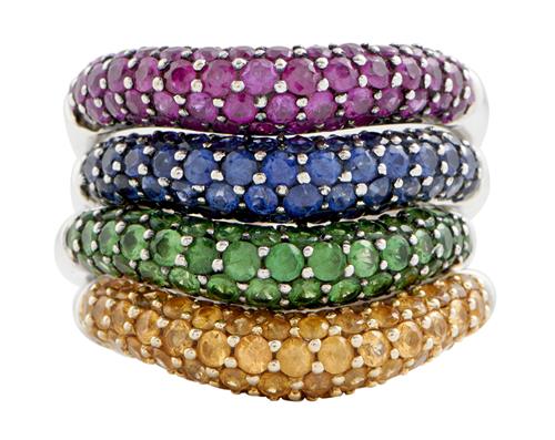 Comprising four curved bands, pavé set with circular-cut rubies, tsavorite garnets, yellow sapphires and sapphires respectively, together weighing approximately 2.00 carats, each size O.