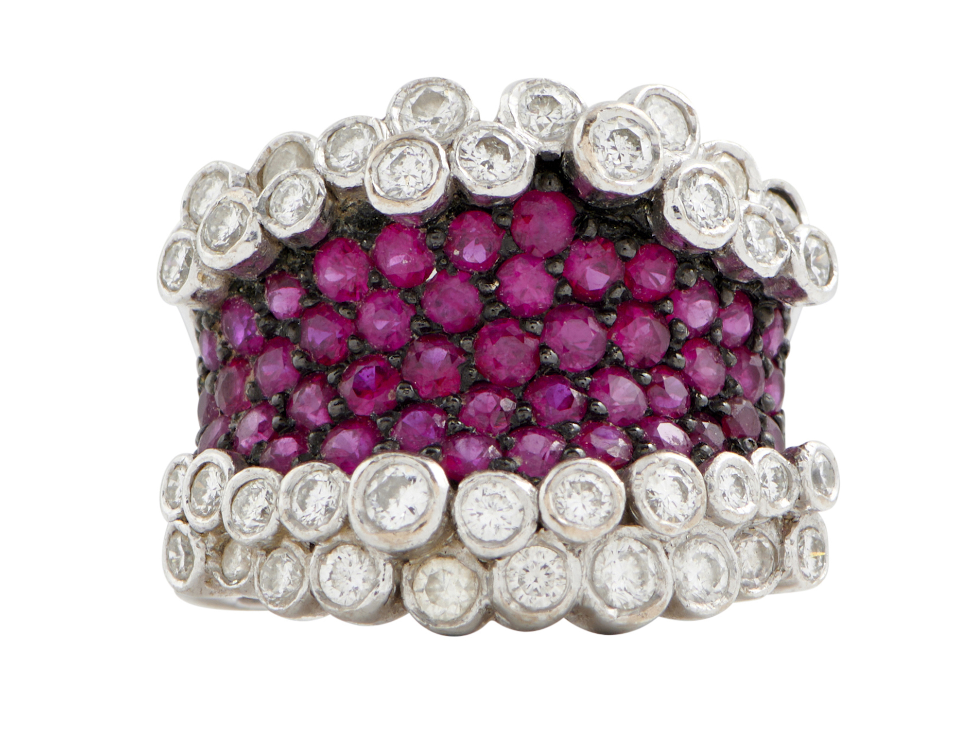 The wide band, comprising a concave panel of forty-four circular-cut rubies together weighing approximately 2.54 carats, within a double border of collet-set brilliant-cut diamonds together weighing approximately 1.31 carats, size L-M.
