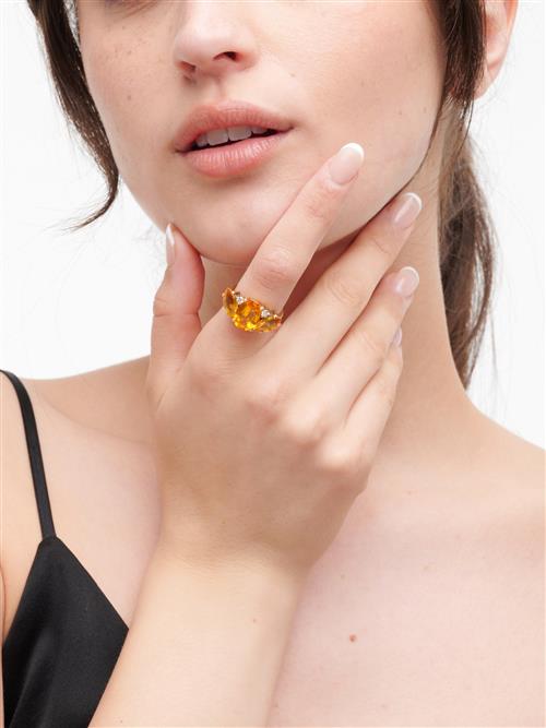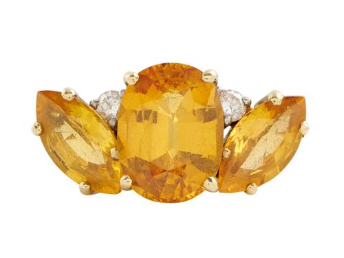 A SAPPHIRE AND DIAMOND RING IN 18CT GOLD, CENTRING A CLAW-SET OVAL-CUT YELLOW SAPPHIRE WEIGHING APPROXIMATELY 4.43 CARATS, FLANKED BY MARQUISE-CUT YELLOW SAPPHIRES TOGETHER WEIGHING APPROXIMATELY 3.35 CARATS, AND BRILLIANT-CUT DIAMONDS TOGETHER WEIGHING APPROXIMATELY 0.15 CARATS, RING SIZE O