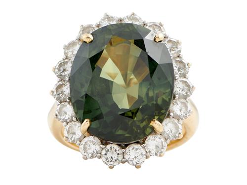 Centring a claw-set oval-cut sapphire weighing approximately 20.05 carats, within a surround of eighteen claw-set brilliant-cut diamonds together weighing approximately 1.95 carats, size M.