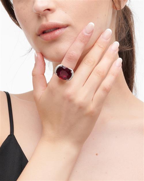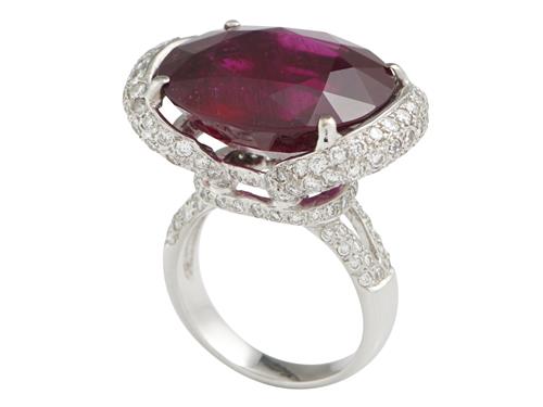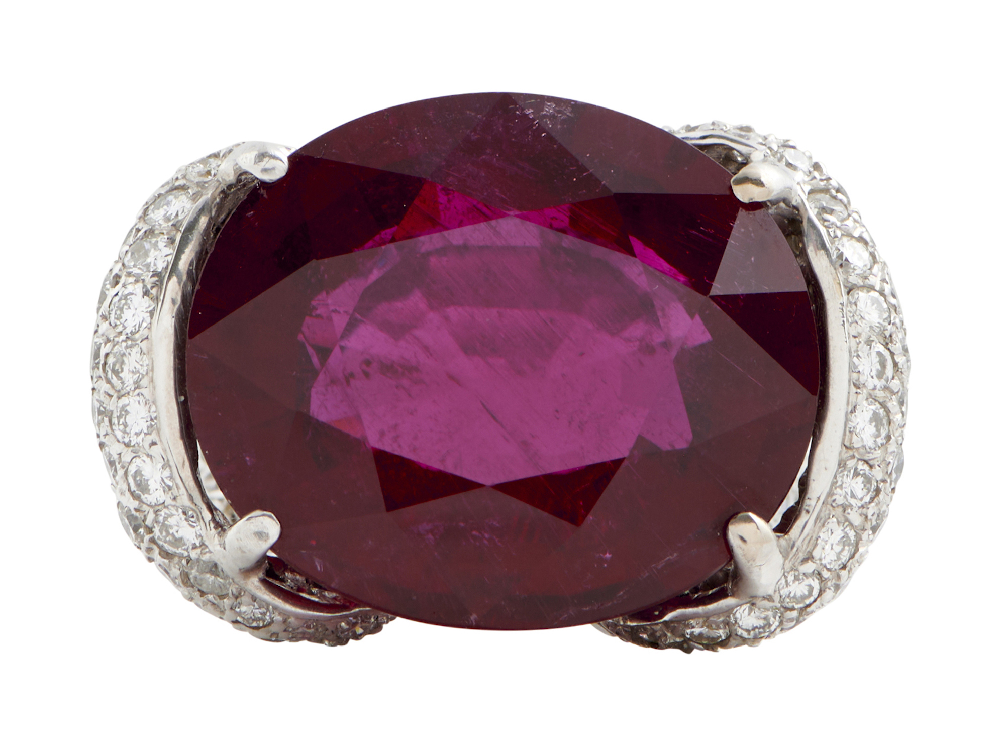 Centring a claw-set oval-cut tourmaline weighing approximately 19.00 carats, with mount, underbezel, and shoulders all pavé set with diamonds together weighing approximately 2.87 carats, size L.