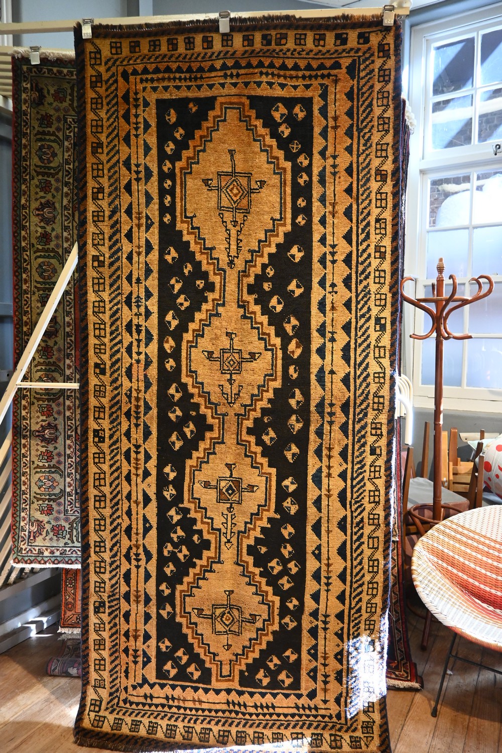 PERSIAN VINTAGE LURI RUG CIRCA 1970'S ,100% WOOL WITH A VINTAGE PILE USING NATURAL DYES. TRIBAL DESIGN OF CONTINUING ANCHORED MEDALLION IN GOLD TONES ON AN INDIGO BLUE FIELD WITH TRIBAL MOTIFS. SIZE: 255 X 114 CM ORIGIN: PERSIA- RRP: $2,100 DOCUMENTATION OF AUTHENTICITY INCLUDED.