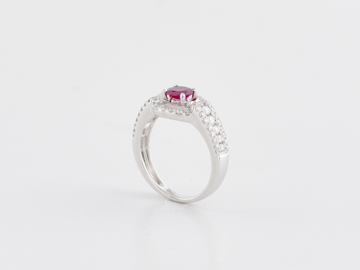 A RUBY AND DIAMOND RING IN 18CT WHITE GOLD, RING SIZE L, THE RUBY TOTALLING 0.62CTS, THE DIAMOND TOTALLING 0.49