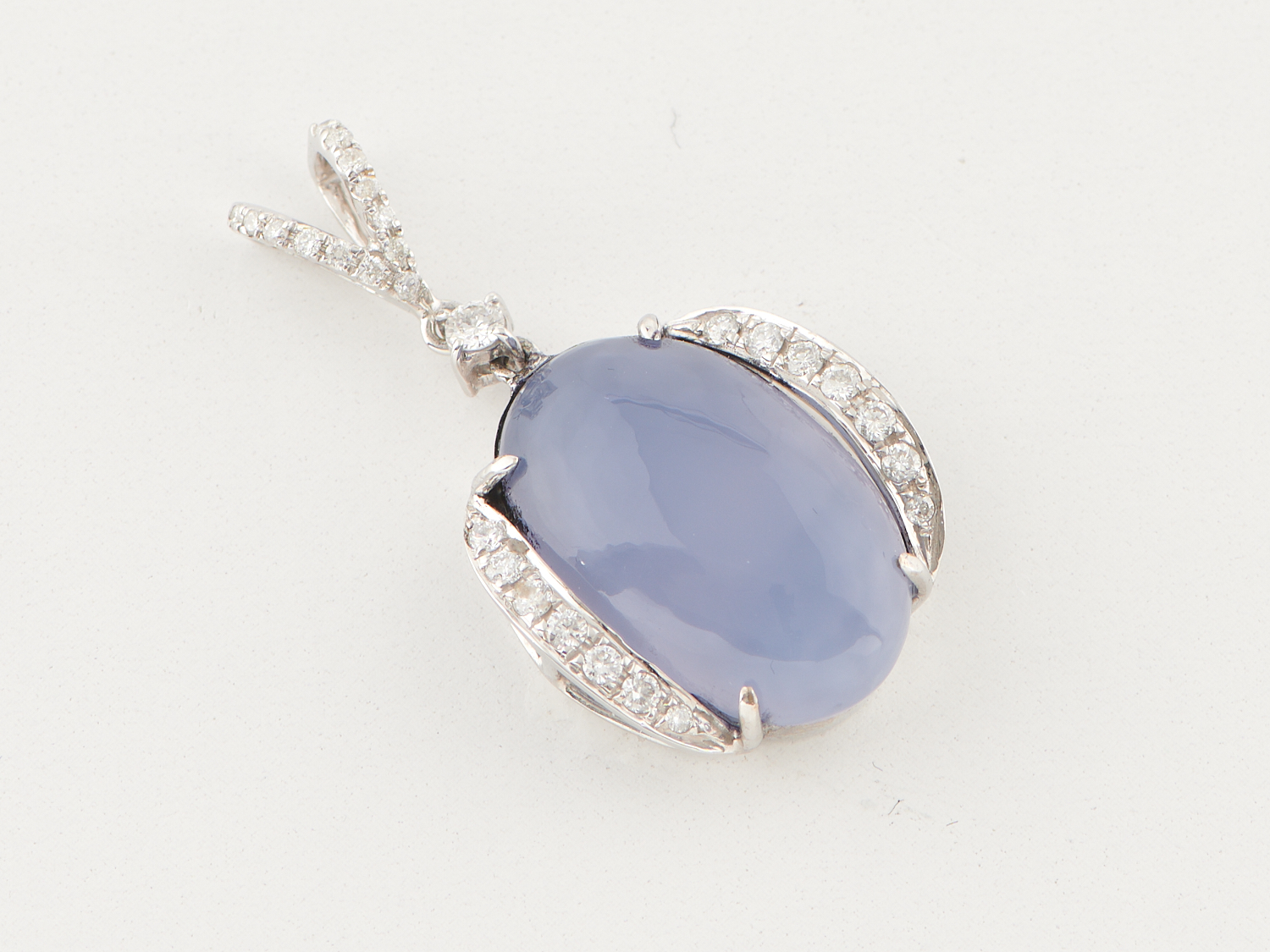 A CHALCEDONY AND DIAMOND PENDANT IN 18CT WHITE GOLD, THE DIAMONDS TOTALLING 0.29CTS