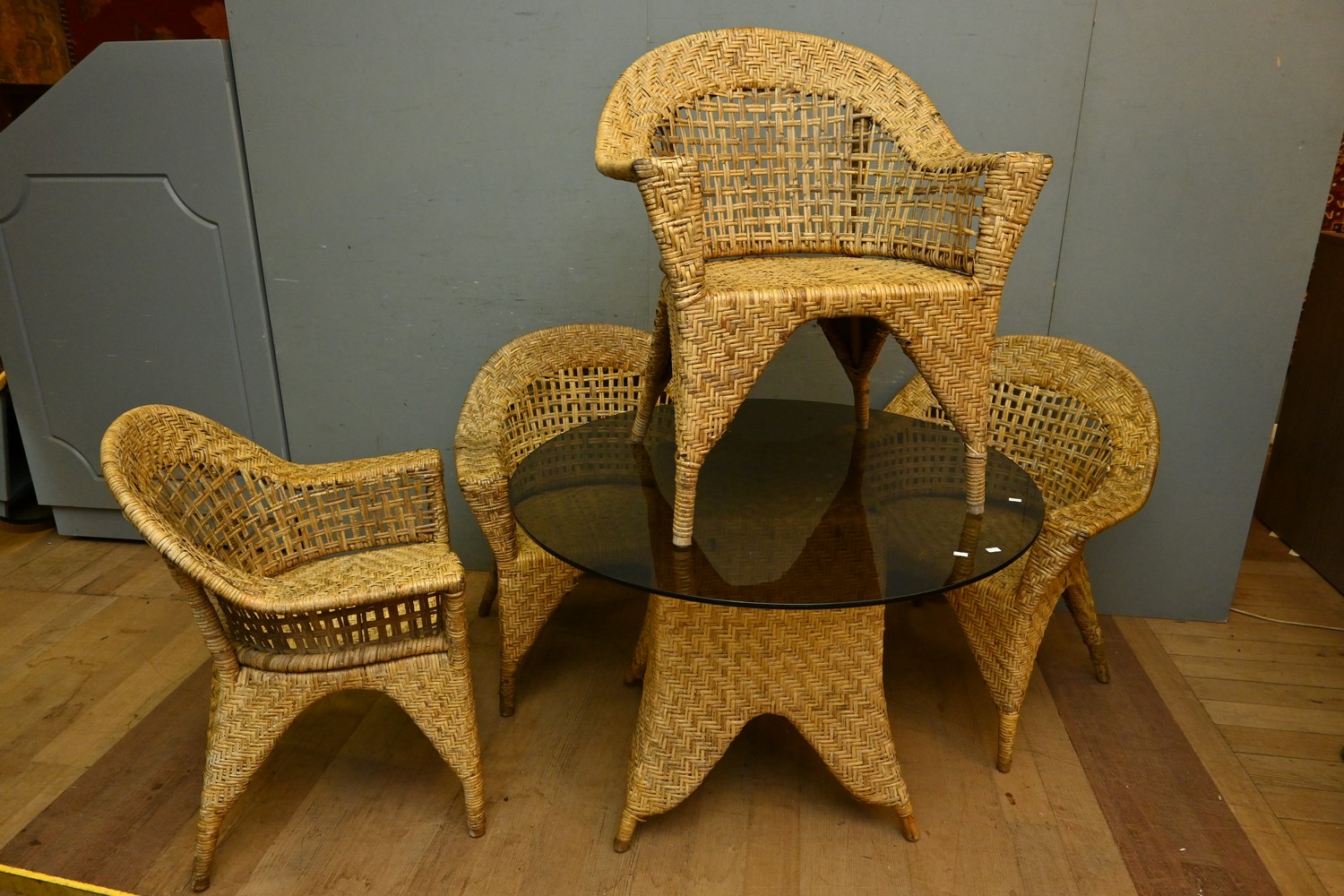 A 1970S AUSTRALIAN FIVE PIECE WOVEN CANE TABLE SETTING (71H X 107D CM) (A/F) (PLEASE NOTE THIS HEAVY ITEM MUST BE REMOVED BY CLIENTS OR CARRIERS AT THE CUSTOMERS EXPENSE. LEONARD JOEL STAFF CANNOT ASSIST CARRYING THIS ITEM)