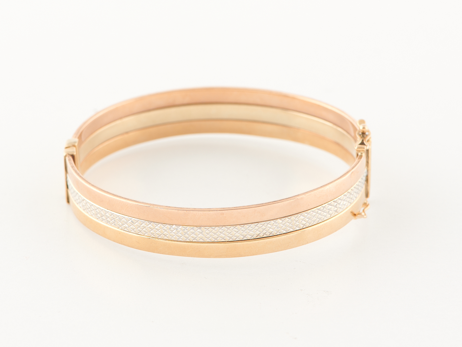 A HINGED BANGLE IN TRI-COLOUR 9CT GOLD, WIDTH OF BANGLE 12MM, INNER DIAMETER 60MM, APPROXIMATE WEITGHT 14.35GMS