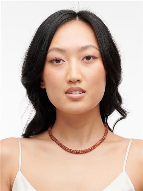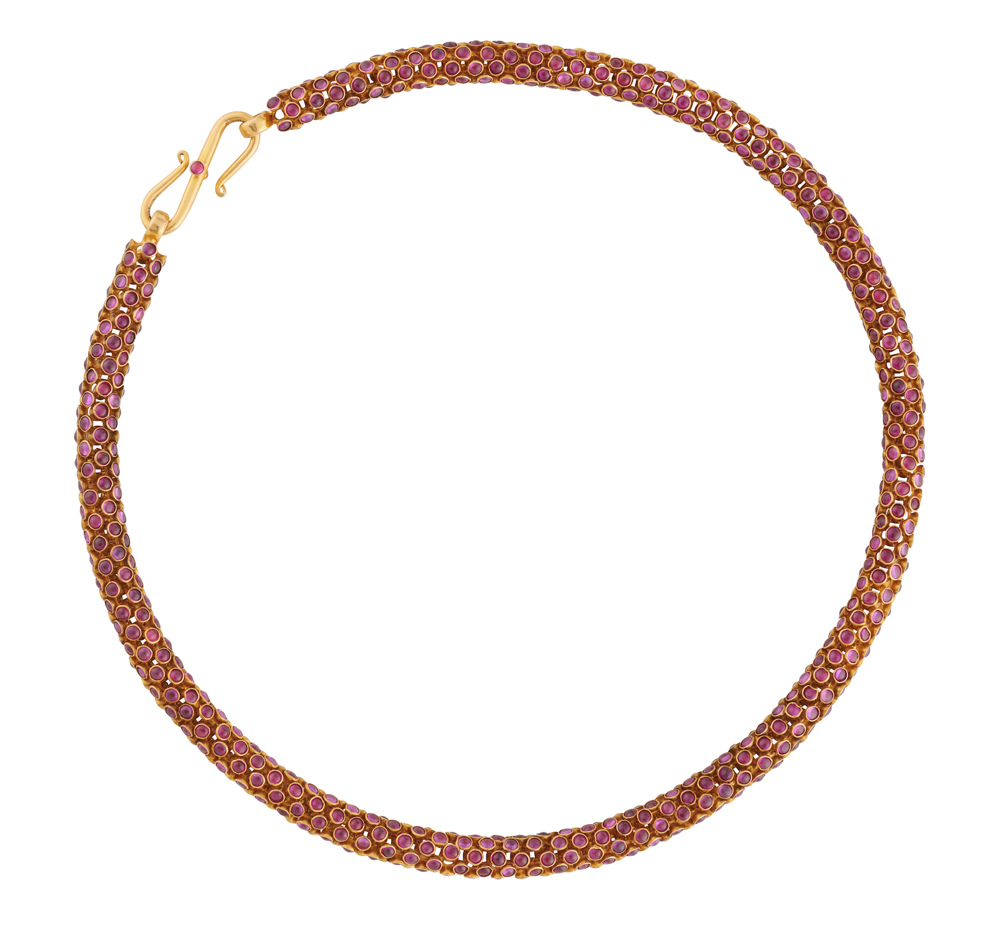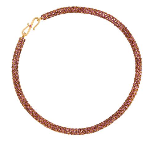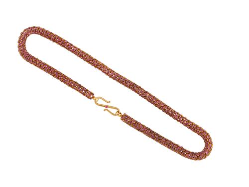 The rounded articulated chain, set with rows of bezel-set circular synthetic rubies cut en cabochon, completed by a s-link clasp, length 460mm.