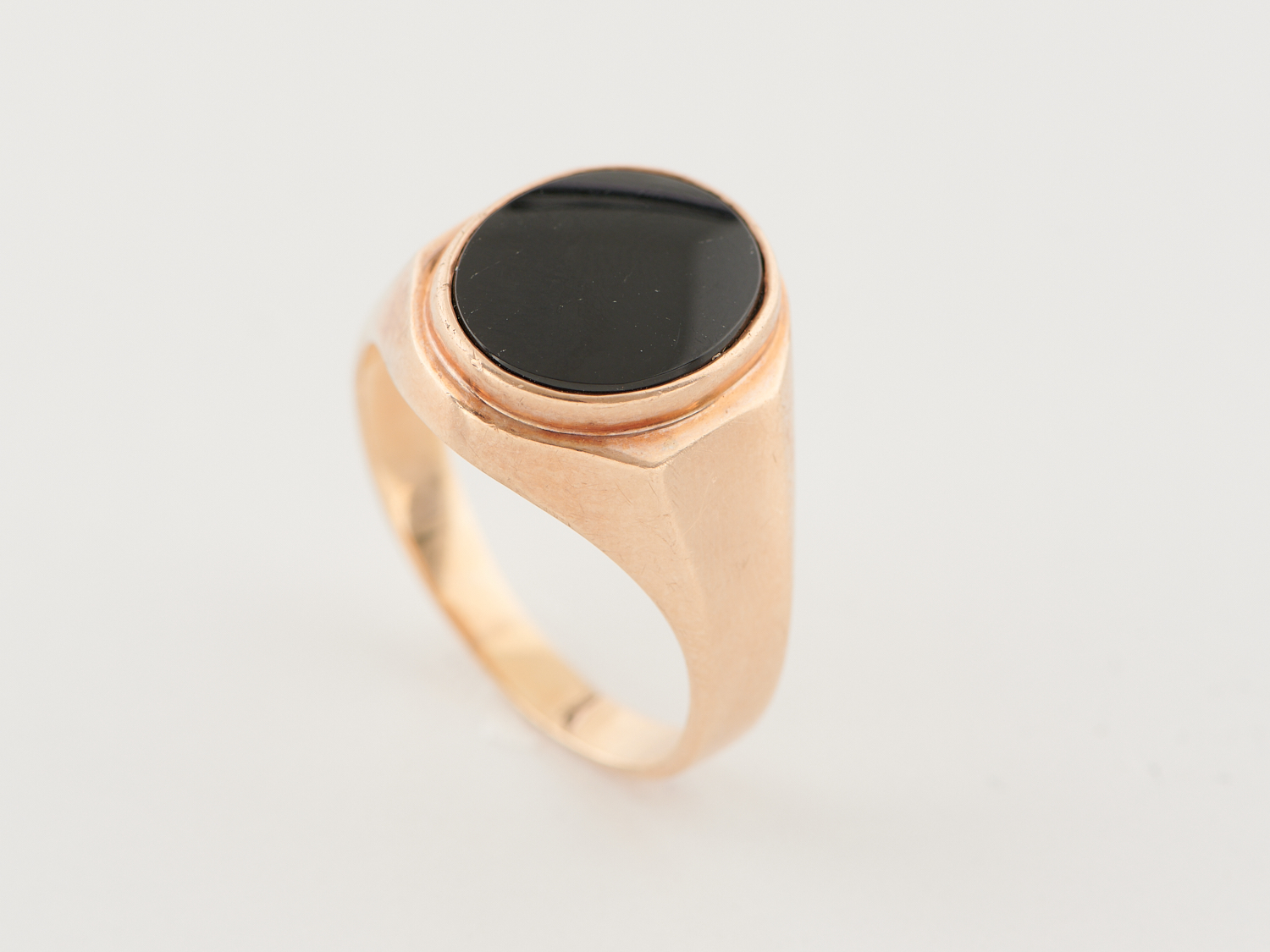 A GENTS ONYX RING IN 9CT GOLD, RING SIZE X, 6.30GMS