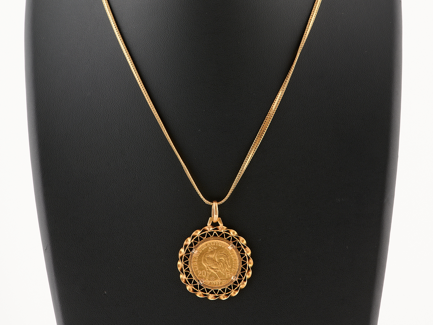 A 20 FRANC COIN IN DECORATIVE 18CT GOLD FRAME (10.8GMS), PENDANT DIAMETER 33MM TO A HERRINGBONE NECKLACE IN 18CT GOLD (8.3GMS), TOTAL LENGTH 450MM