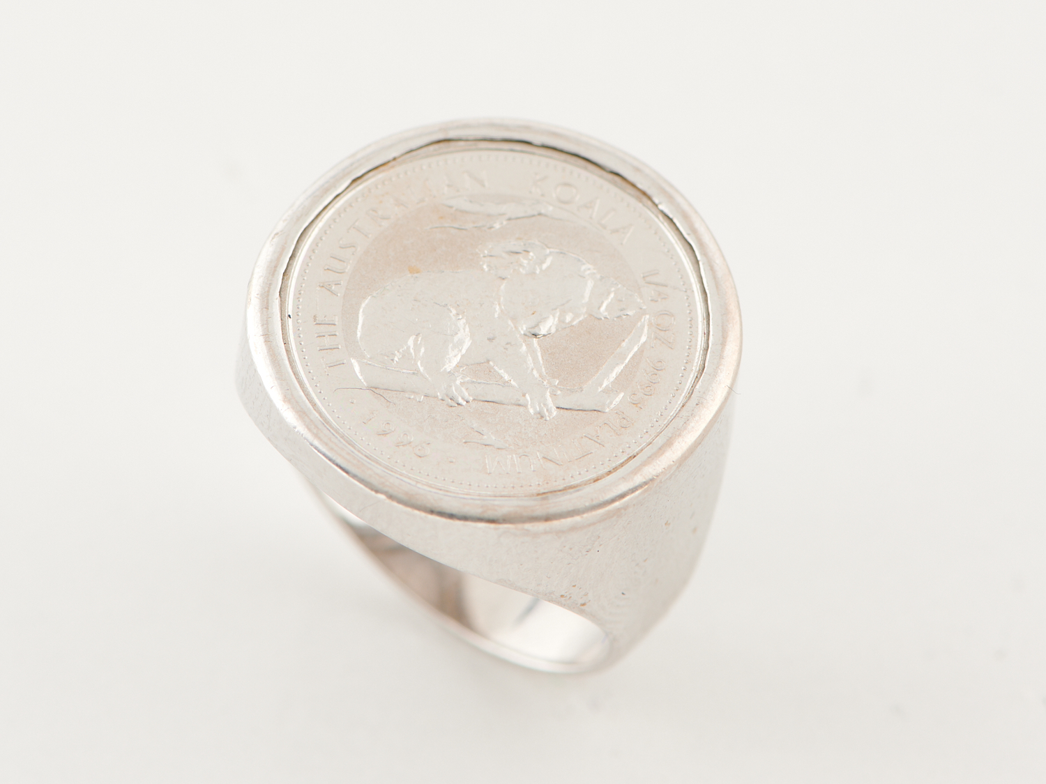 A 1/4 OZ PLATINUM KOALA COIN SIGNET RING IN 18CT WHITE GOLD BY JORDANS, SIZE T, 16.90GMS
