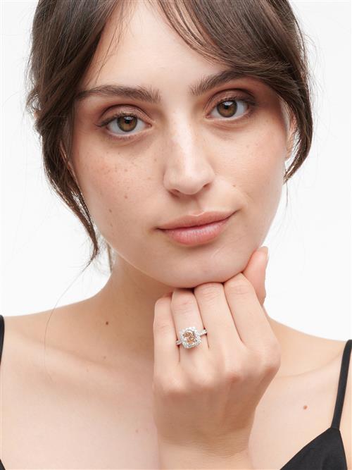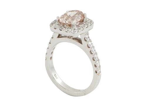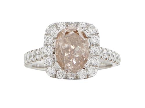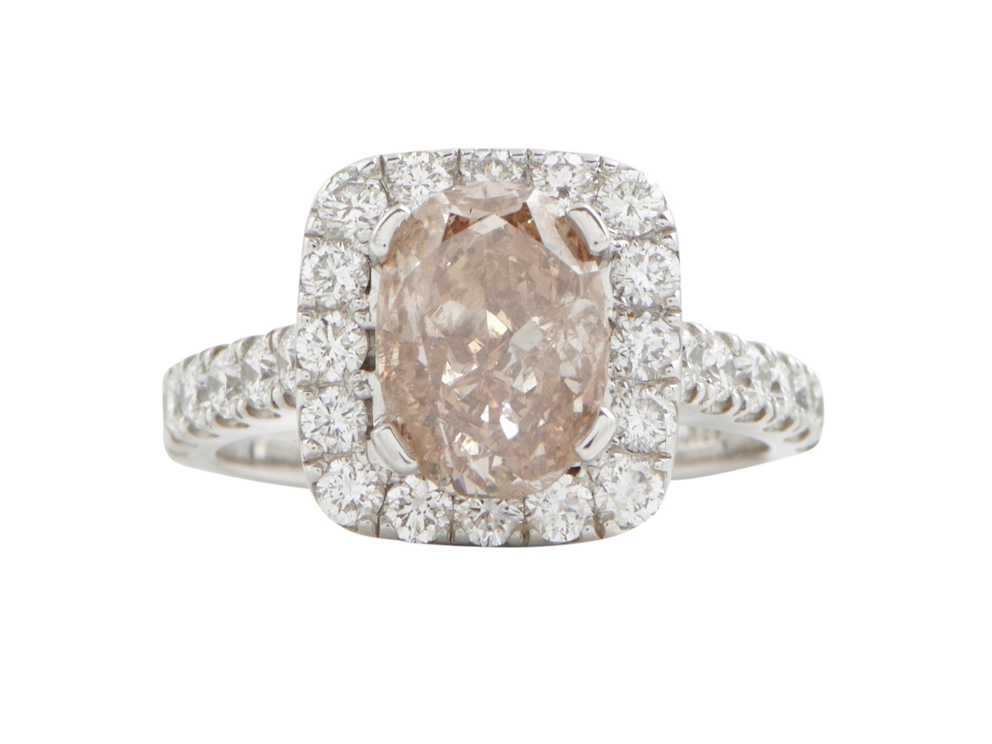 Centring a claw-set oval-cut champagne diamond weighing approximately 2.10 carats, within a square surround and shoulders detailed with brilliant-cut diamonds together weighing approximately 0.84 carats, size K.