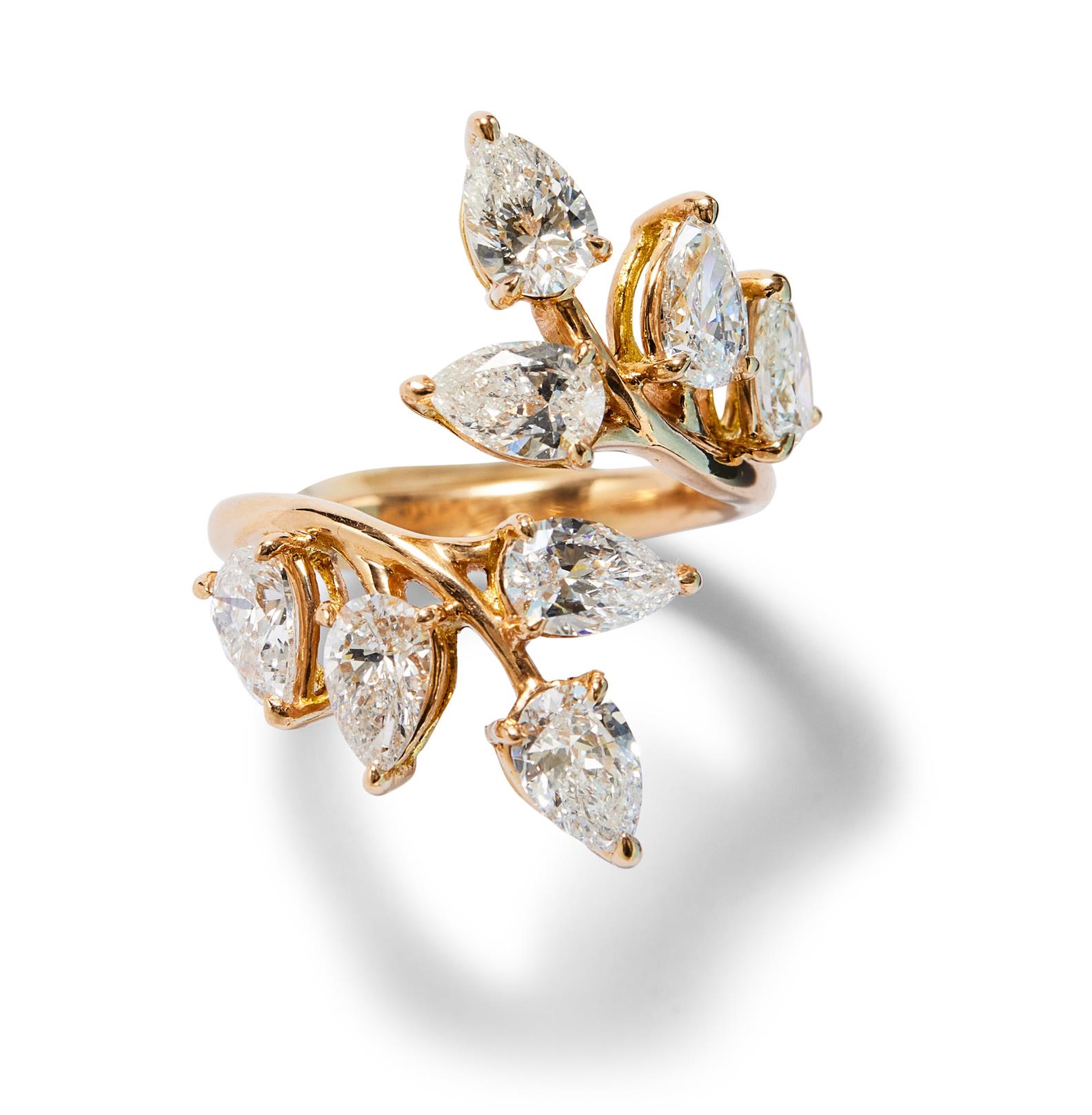 Of toi et moi design, terminating in claw-set pear-shaped diamonds together stated to weigh 4.12 carats, mounted in 18ct pink gold, size O.