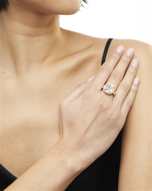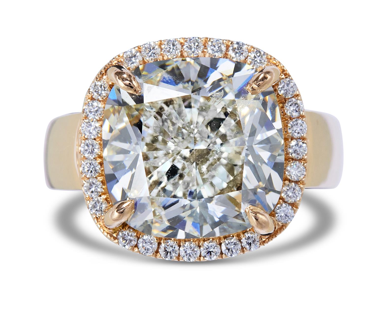 Centring a claw-set cushion modified brilliant-cut diamond weighing 10.04 carats, framed by pavé-set brilliant-cut diamonds, the small diamonds together weighing approximately 0.14 carats, mounted in 18ct pink gold, size M1/2.