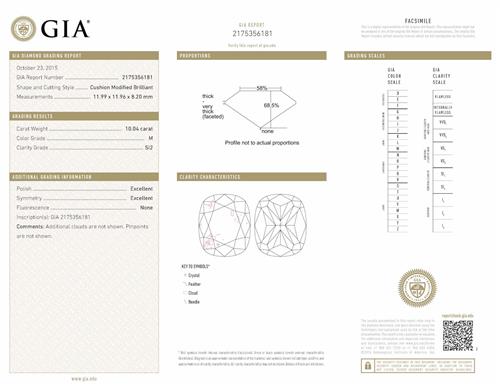 Accompanied by a GIA report numbered 2175356181, dated 23 October 2015, stating that the 10.04 carat diamond is natural, M colour, SI2 clarity.