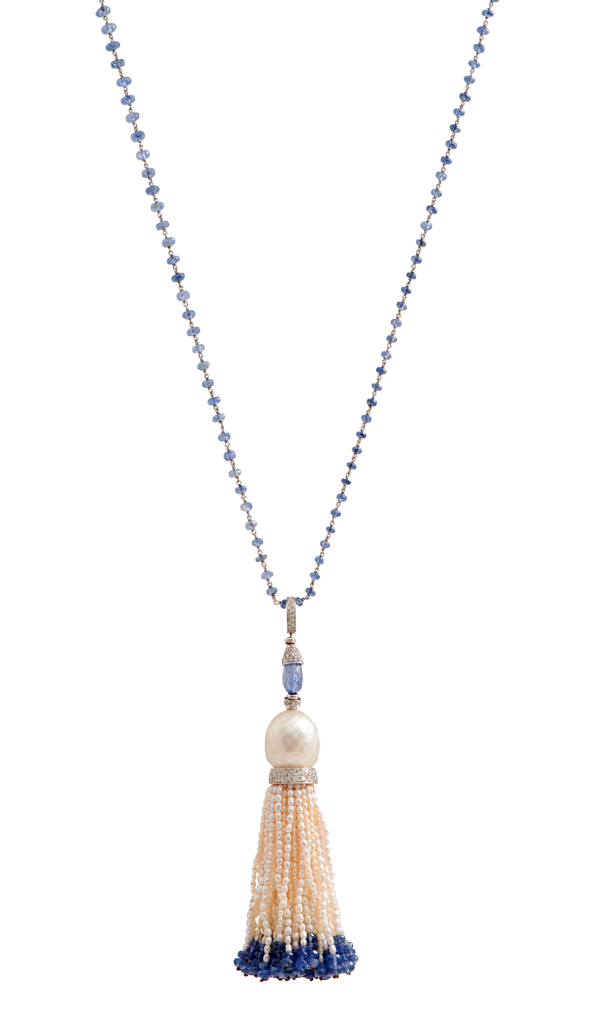 The sapphire bead longchain terminating in a pendant centring a faceted pearl of white hues measuring approximately 14.5mm, with diamond set cap suspended with pearl and sapphire bead set tassels, competed by a bolt ring clasp, length approximately 970mm - 1020mm adjustable.