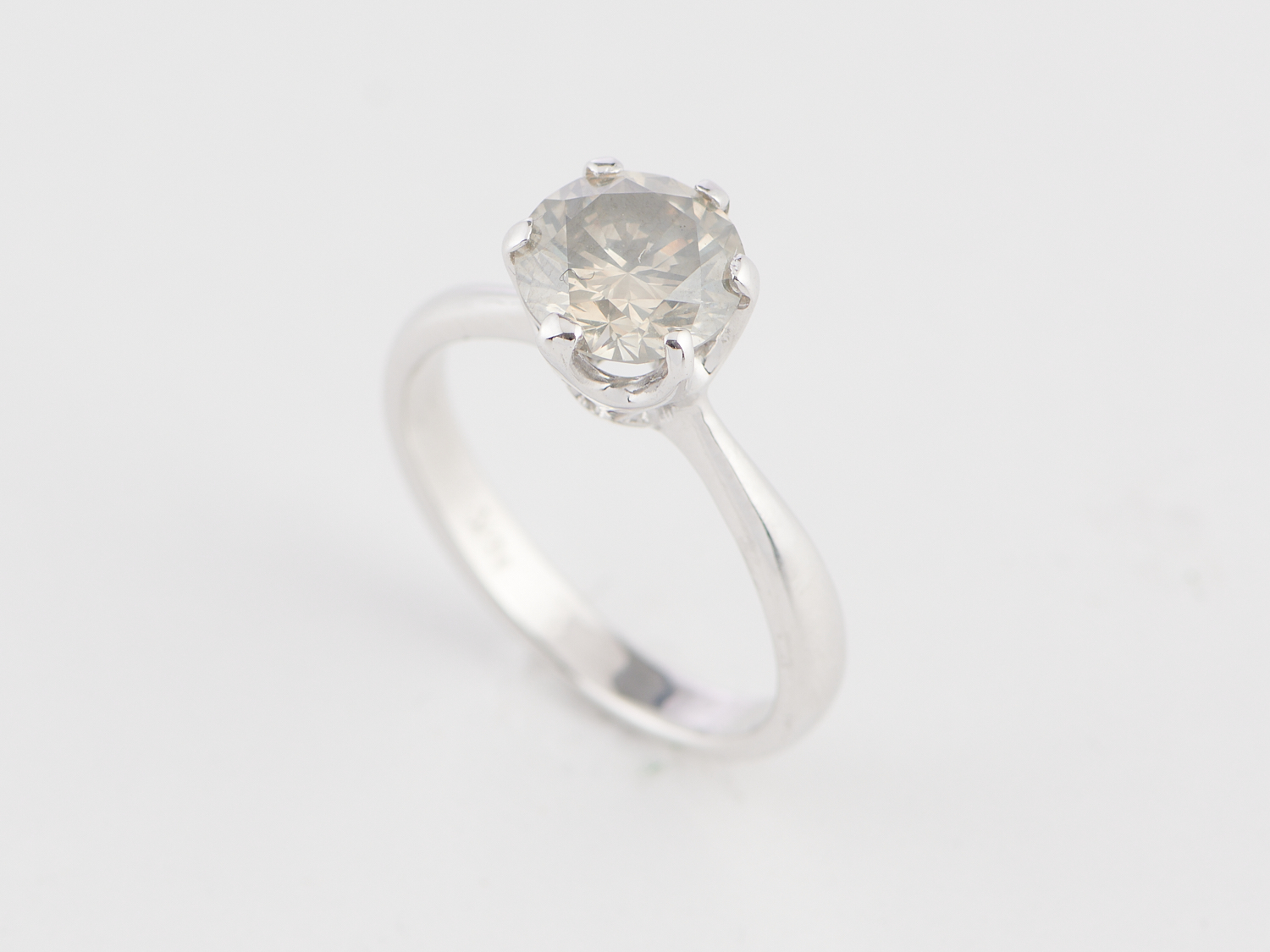 A COLOURED SOLITAIRE DIAMOND RING IN 18CT WHITE GOLD, THE DIAMOND TOTALLING 1.84CTS, SI CLARITY, RING SIZE N, ACCOMPANIED BY A VALUATION
