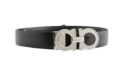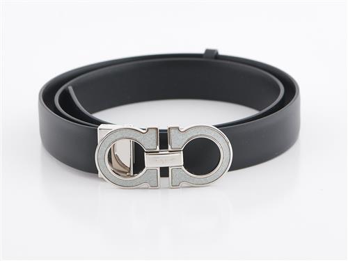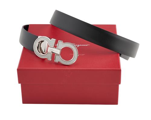 The black leather belt with silver tone metal glittered Gancini buckle, size 87, boxed