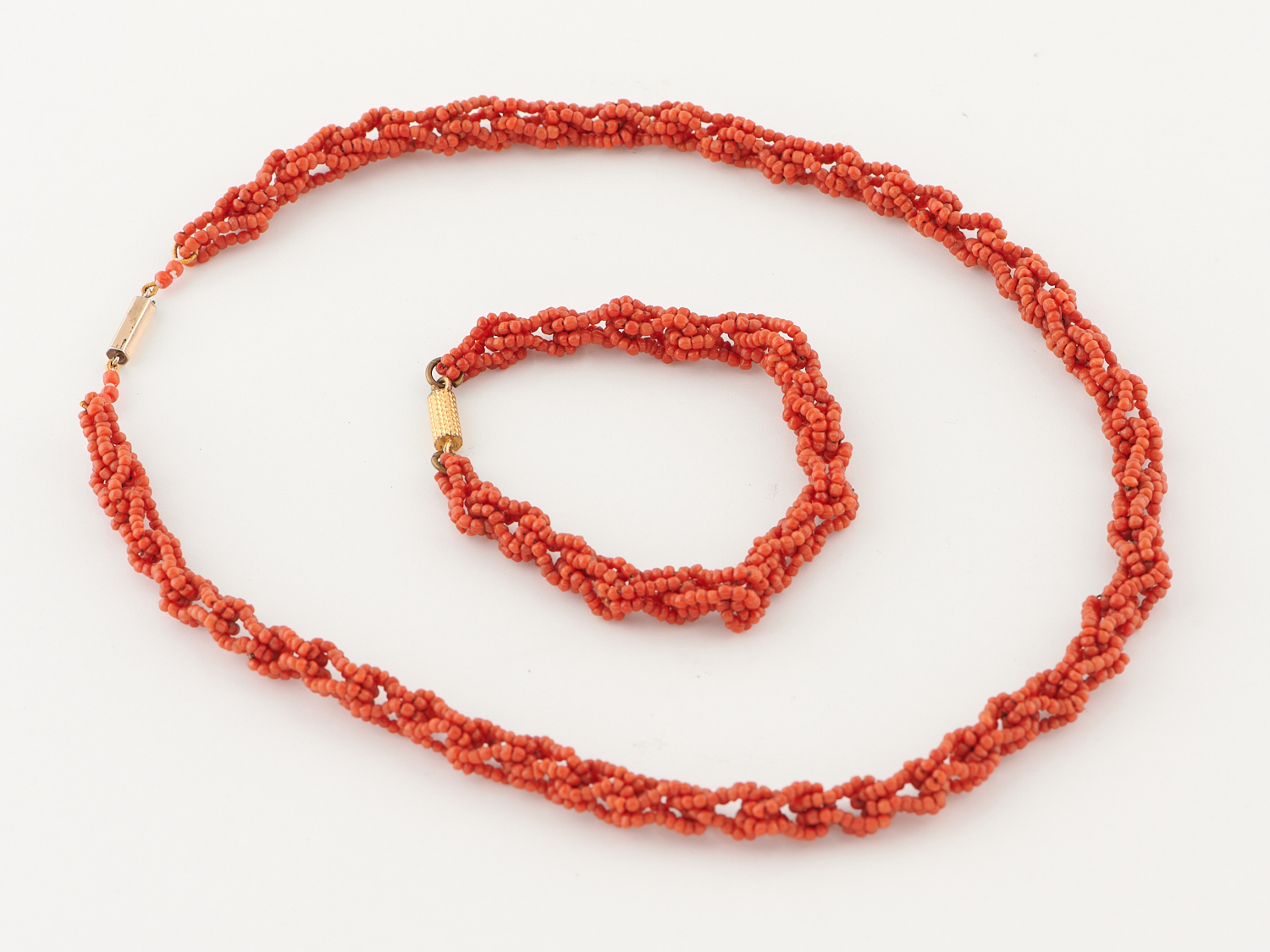 A VINTAGE CORAL PLAITED BEAD NECKLACE AND BRACELET, NECKLACE LENGTH 555MM, BRACELET LENGTH 222MM