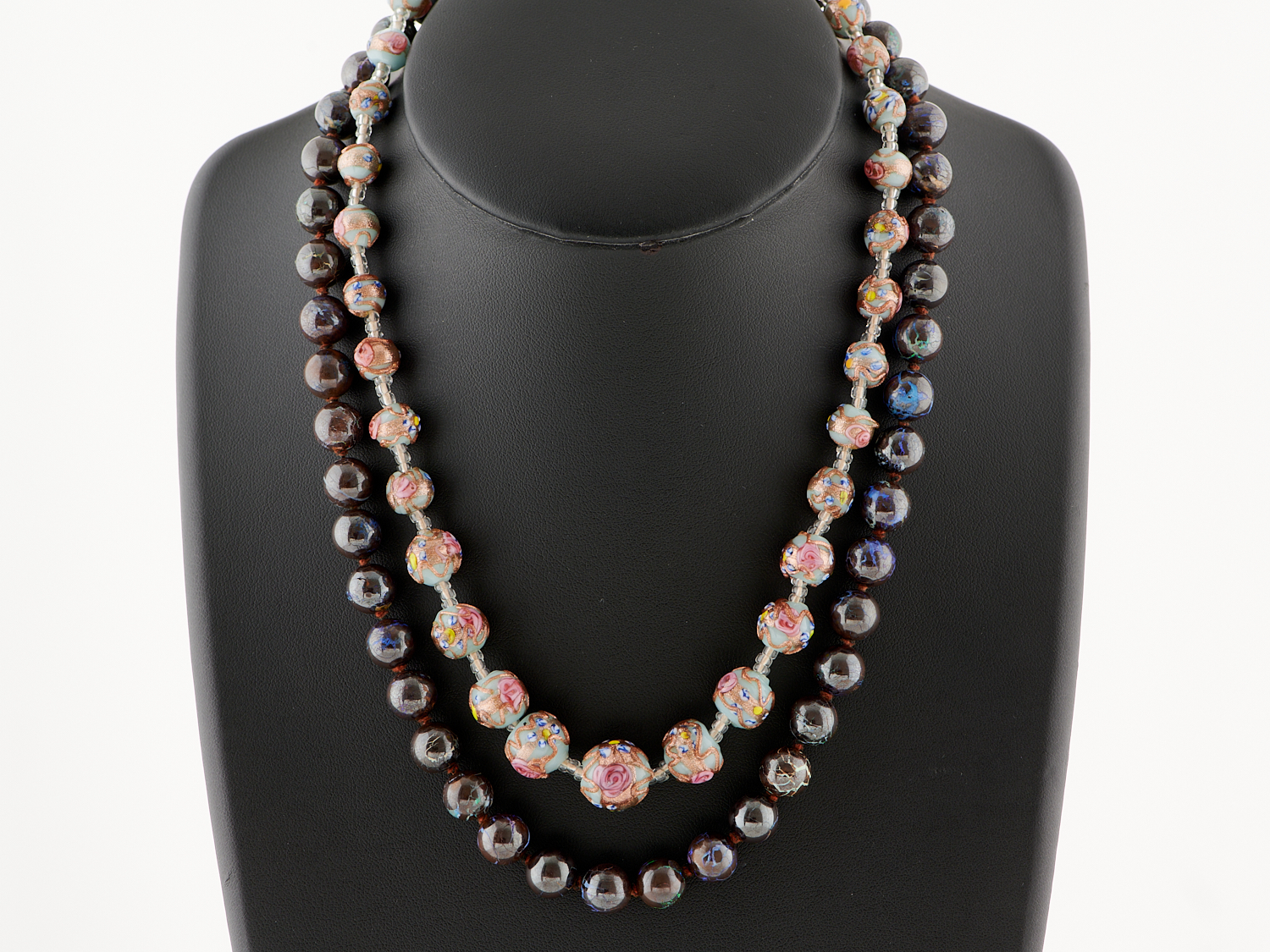 A VINTAGE GLASS NECKLACE, LENGTH 445MM AND A BOULDER OPAL BEADED NECKLACE TO A 9CT GOLD CLASP, LENGTH 500MM