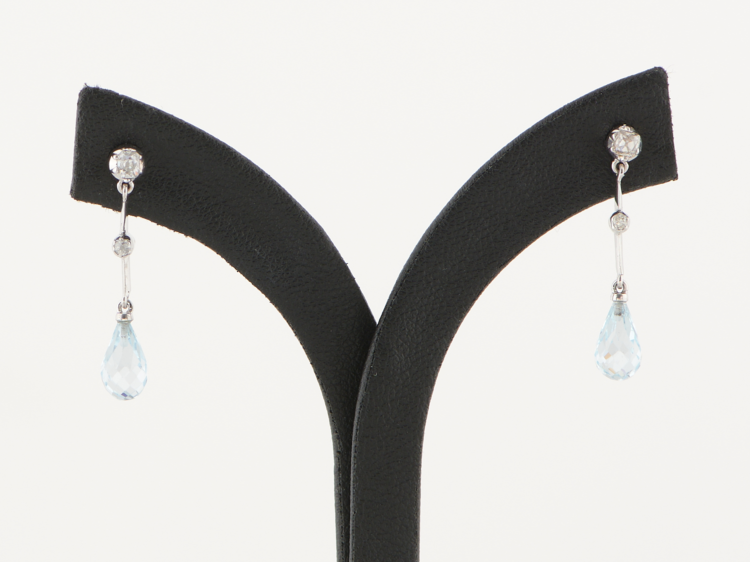A PAIR OF BRIOLETTE CUT BLUE TOPAZ AND DIAMOND EARRINGS IN 9CT WHITE GOLD, LENGTH 25MM, WEIGHT 1.98GMS