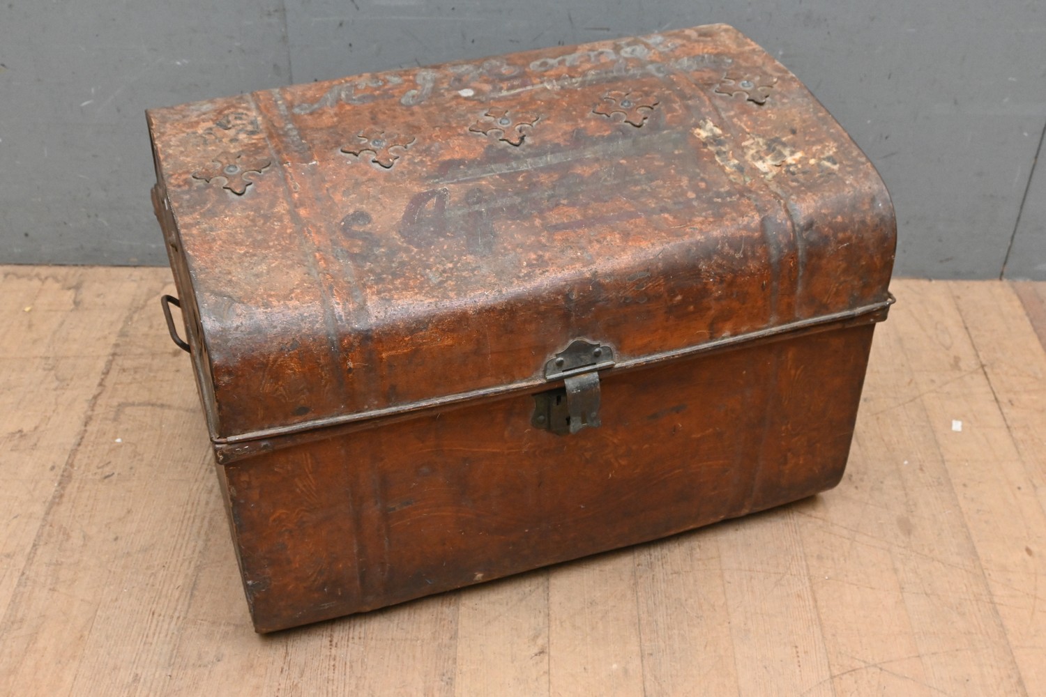 A 1920'S ENGLISH TRAVELLER'S TRUNK (A/F) (52H X 75W X 50D CM) (LEONARD JOEL DELIVERY SIZE: LARGE)