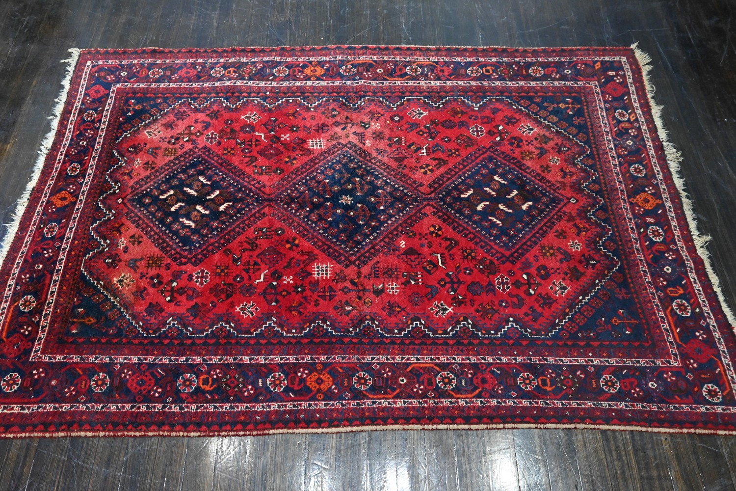 A TRIBAL RUG WITH A DEEP CRIMSON FIELD, THREE LARGE CENTRAL DIAMONDS (A/F) (310 X 201 CM) (LEONARD JOEL DELIVERY SIZE: LARGE)