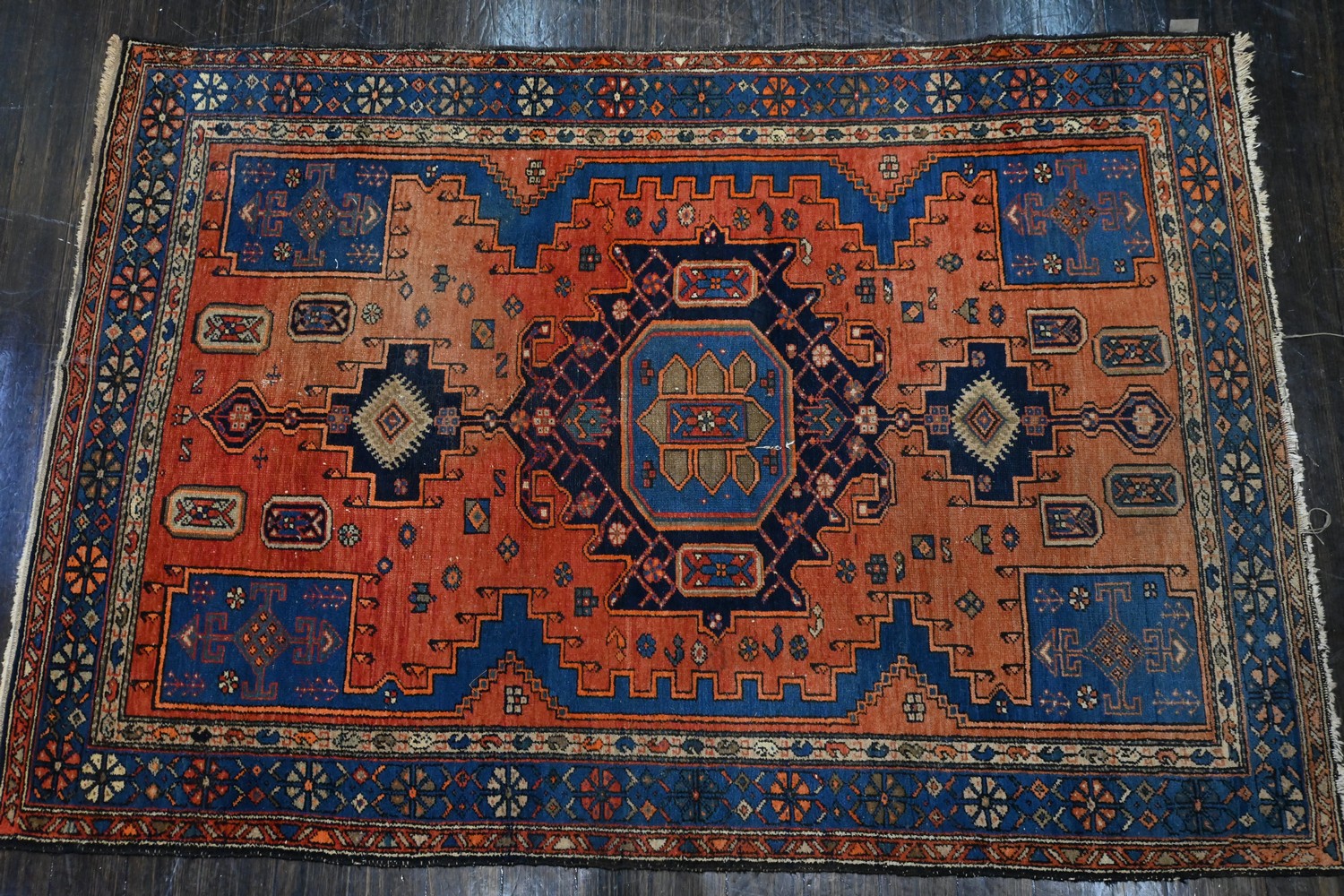 A TRIBAL RUG WITH A MADDER AND BLUE FIELD, AND CENTRAL STEPPED DIAMOND DESIGN (199 X 132 CM) (LEONARD JOEL DELIVERY SIZE: LARGE)