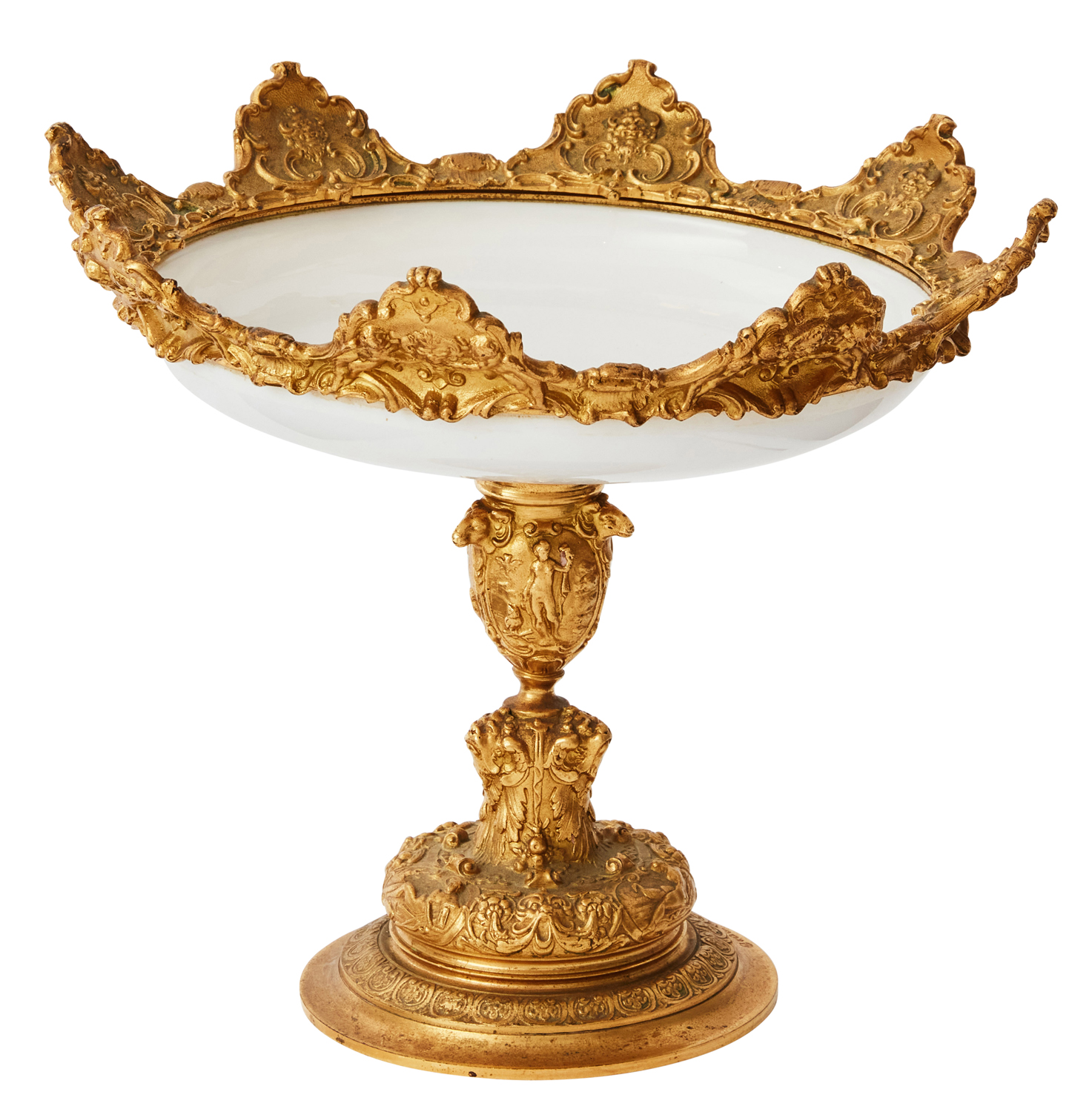 A VICTORIAN MILK GLASS AND GILTMETAL TAZZA BY ELKINGTON & CO