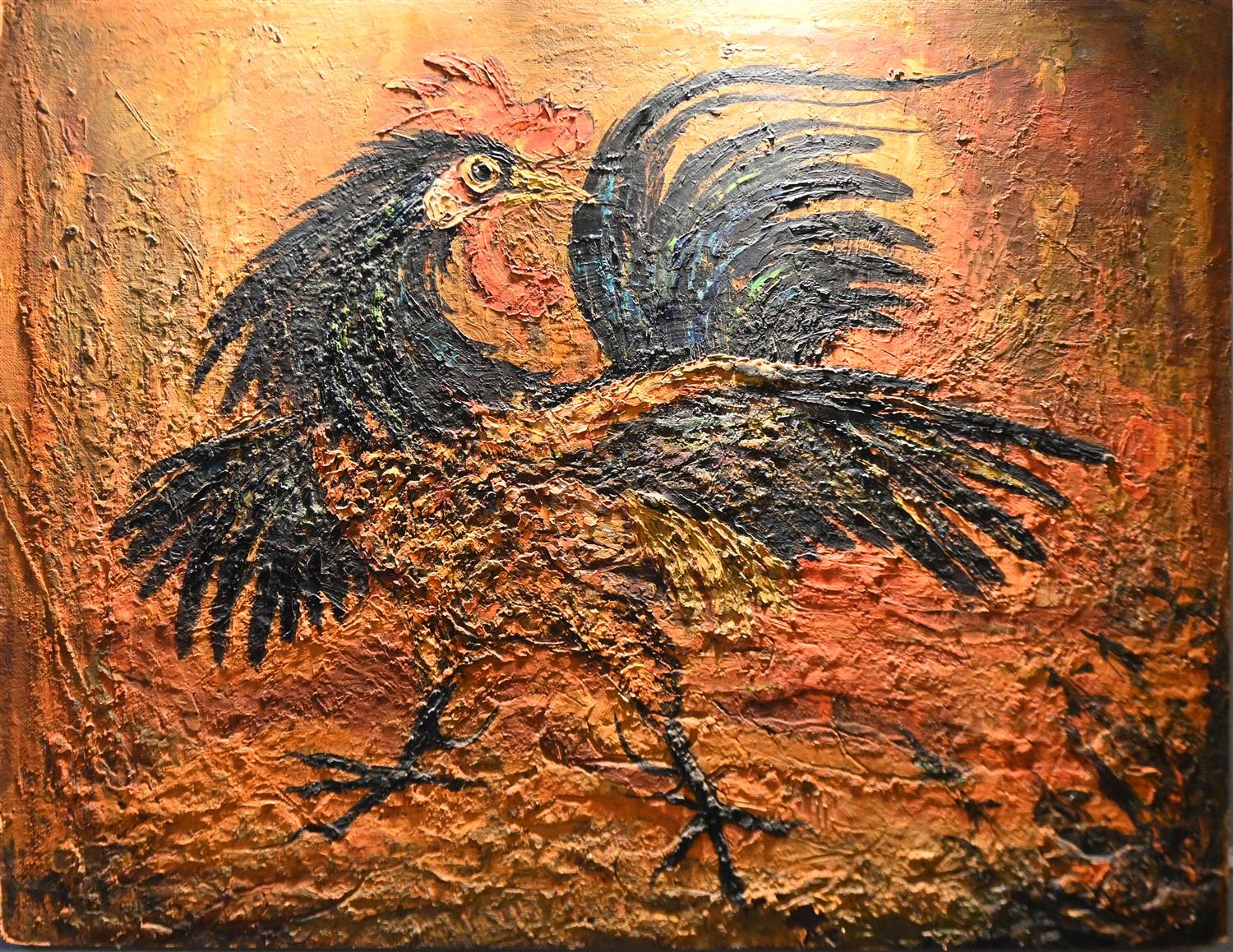 Surface dust and dirt, foreign matter across work and a screw evident upper left side. Wear to the edges. Work ready to hang.