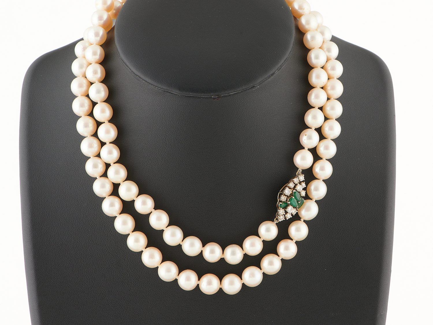 A STRAND OF CULTURED PEARLS TO A DIAMOND AND EMERALD SET NAVETTE CLASP IN 14CT GOLD, TOTAL APPROXIMATE DIAMOND WEIGHT 0.90CTS, TOTAL LENGTH 850MM