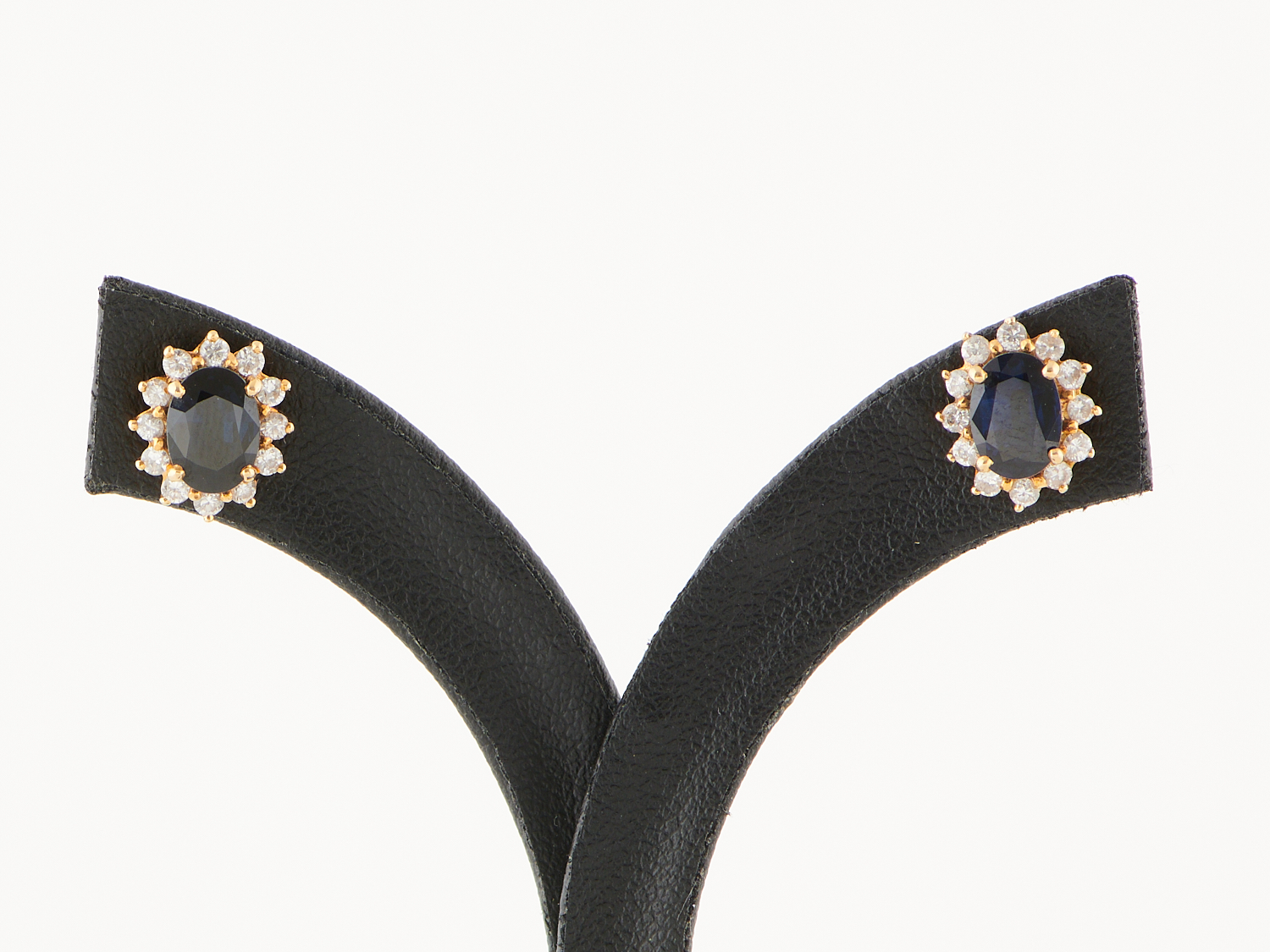 A PAIR OF SAPPHIRE AND DIAMOND EARRINGS IN 18CT GOLD, TOTAL APPROXIMATE WEIGHT OF SAPPHIRES 1.50CTS, TOTAL APPROXIMATE WEIGHT OF DIAMONDS 0.36CTS TO POST AND BUTTERFLY FITTINGS