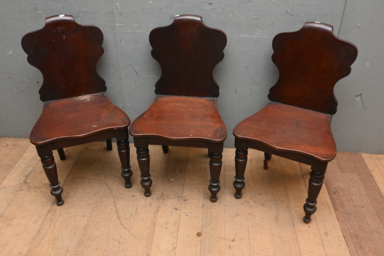 THREE MAHOGANY HALL CHAIRS (A/F) ( 81H X 45W X 46D CM) (LEONARD JOEL DELIVERY SIZE: LARGE)