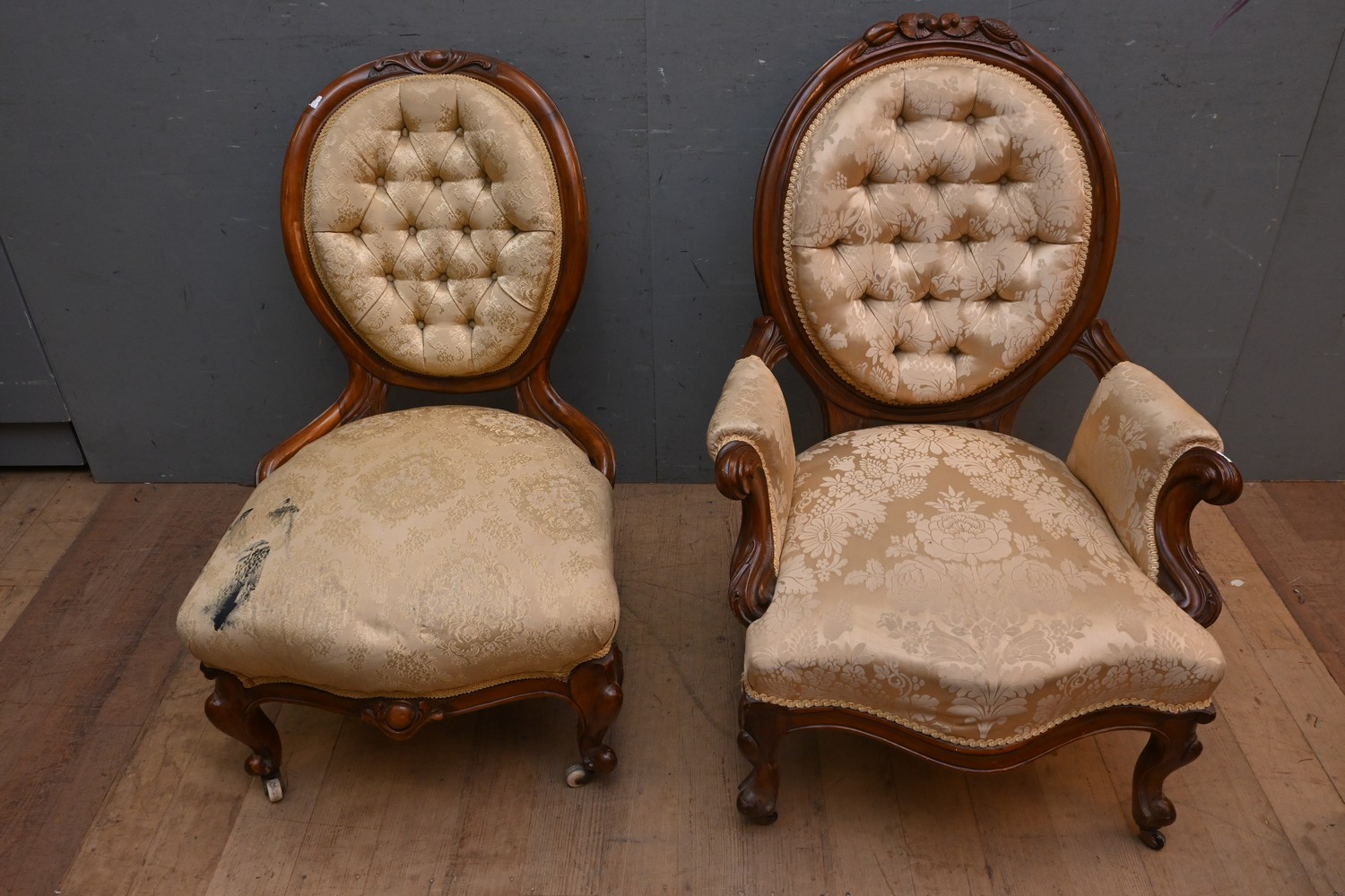 A MATCHED VICTORIAN LADIES AND GENTS CHAIR (A/F) ( 94H X 69W X 83D CM) (LEONARD JOEL DELIVERY SIZE: X-LARGE)