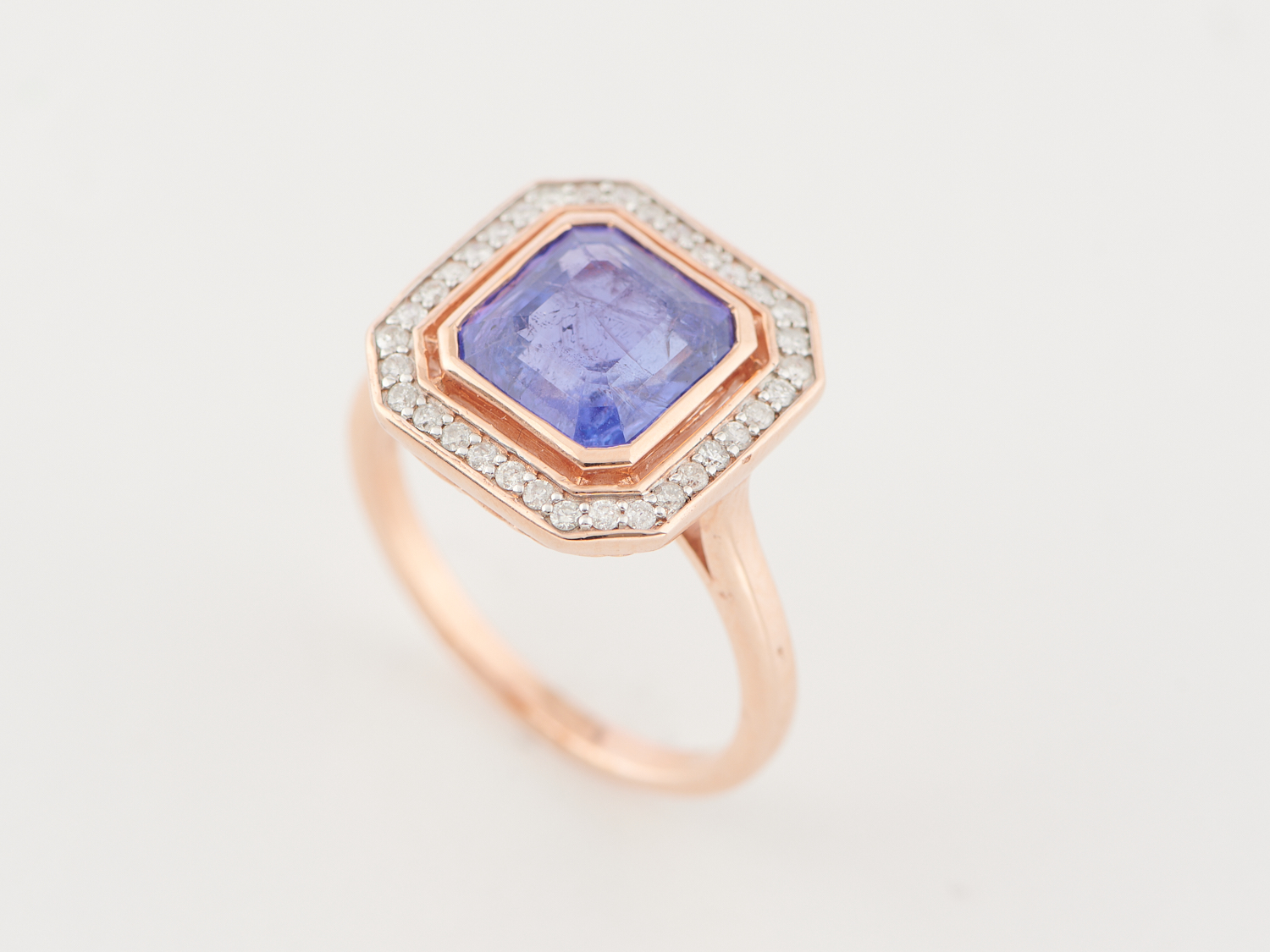 A TANZANITE AND DIAMOND RING IN 14CT ROSE GOLD, THE TANZANITE WEIGHING APPROXIMATELY 3.22CTS, THE DIAMONDS TOTALLING APPROXIMATELY 0.22CTS, SIZE O, 5.5GMS