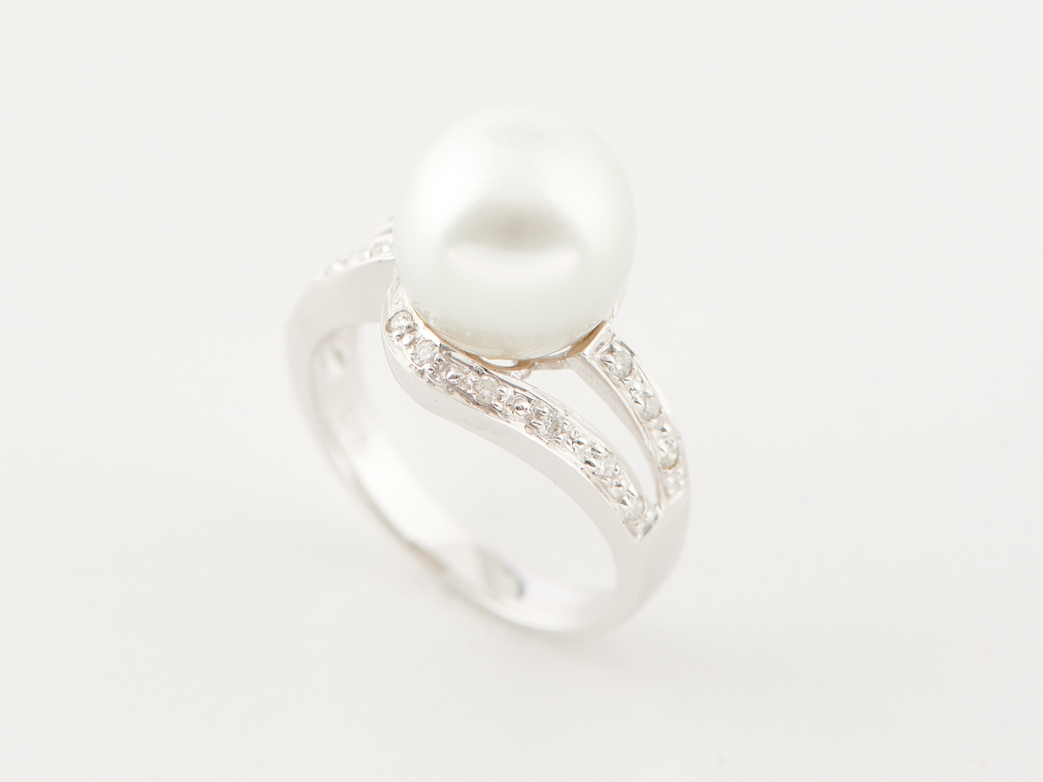 A SOUTH SEA PEARL AND DIAMOND RING IN 18CT WHITE GOLD, THE PEARL MEASURING APPROXIMATELY 10.24MM, RING SIZE L, 6.1GMS